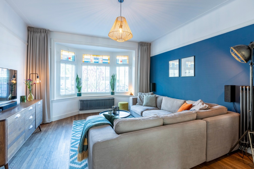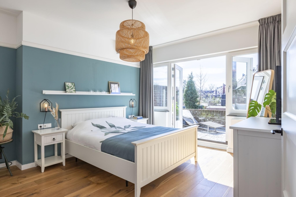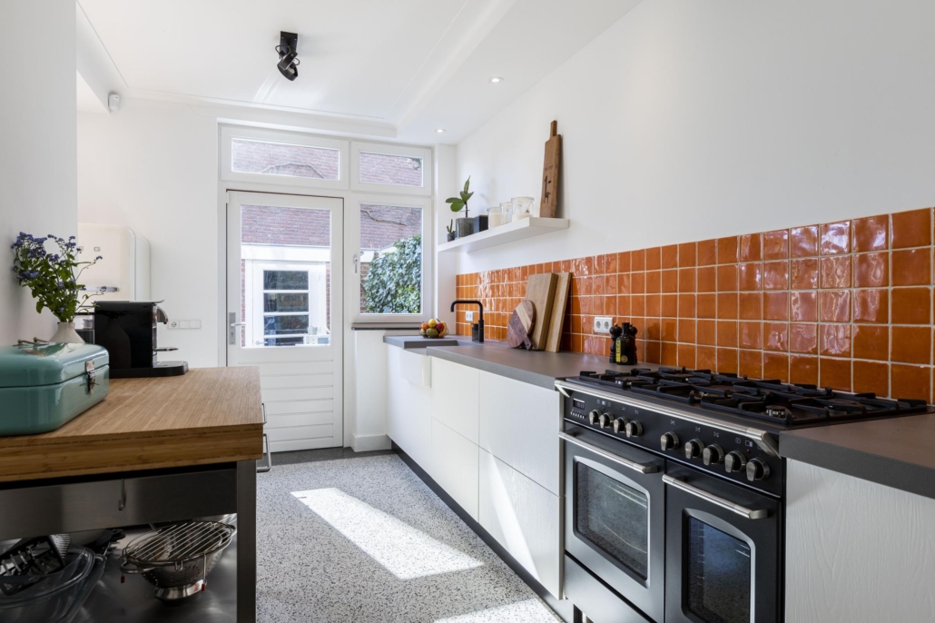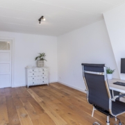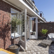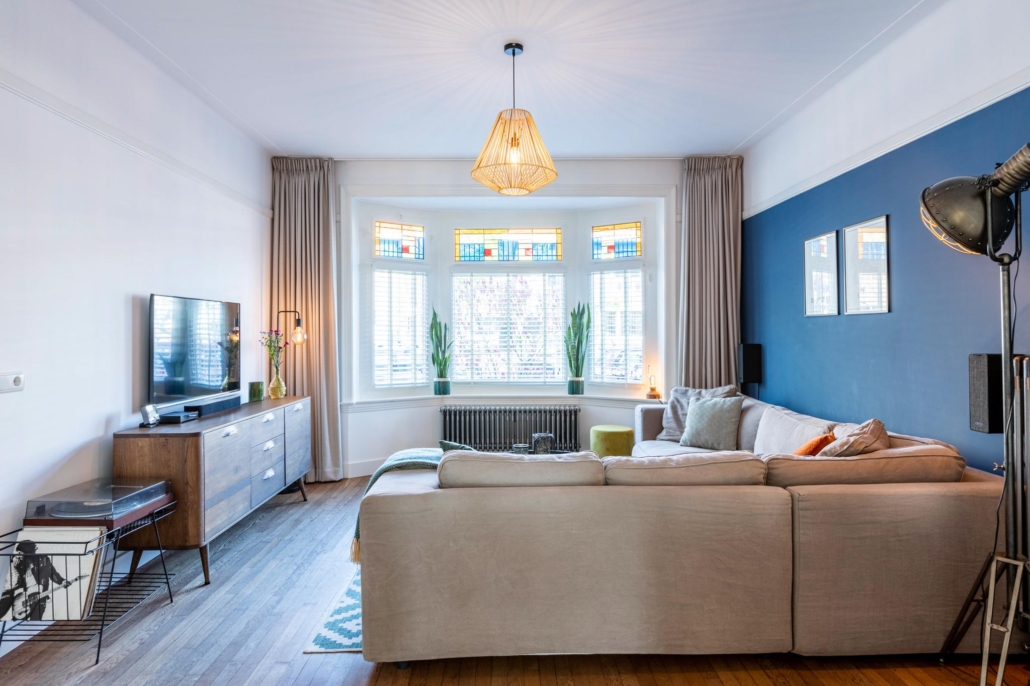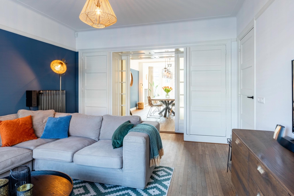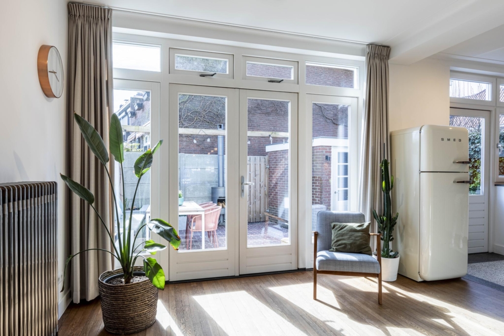 Spacious, deep living room with the original oak floor. The living room is separated by en-suite doors with original glass and cupboards on both sides. At the front of the house there is an attractive bay window with stained glass windows (HR++). Large windows at the rear provide plenty of natural light. The backyard is accessible through French doors.
