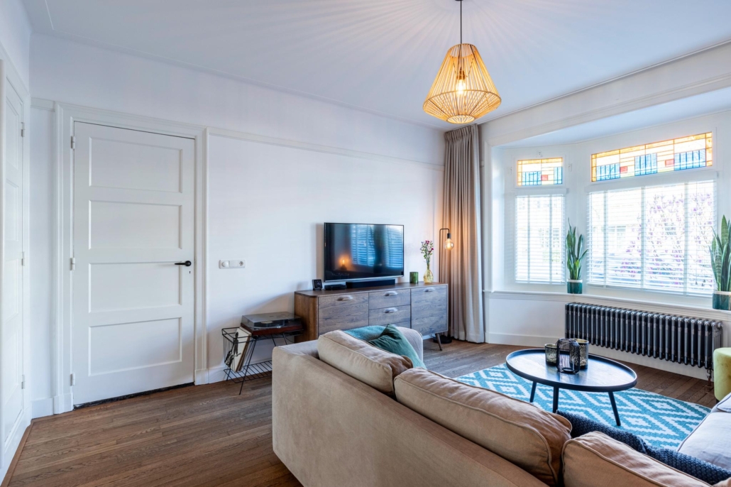 Riante, diepe woonkamer voorzien van de originele eikenhouten vloer. De woonkamer wordt gescheiden middels en-suite deuren met origineel glas en aan beide zijden kasten. Aan de voorzijde van de woning een sfeervolle erker met glas-in-lood ramen (HR++). Aan de achterzijde grote raampartijen die zorgen voor veel natuurlijk lichtinval. Middels openslaande tuindeuren is de achtertuin toegankelijk.
