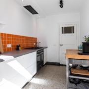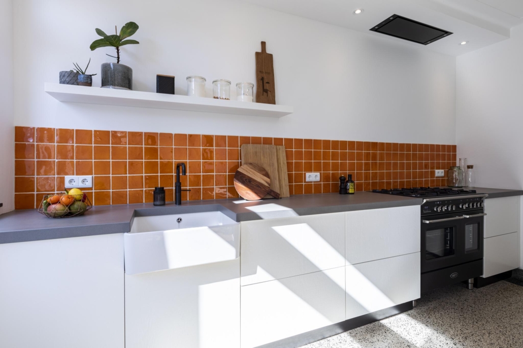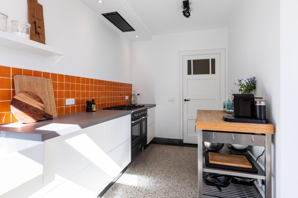 The semi-open kitchen is located at the rear. Modern longitudinal kitchen with various built-in appliances such as Boretti gas stove with various ovens, ceiling extractor unit, dishwasher, sink with Quooker and a separate Smeg fridge/freezer combination (for sale).
