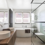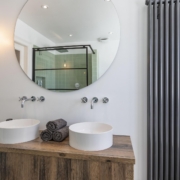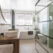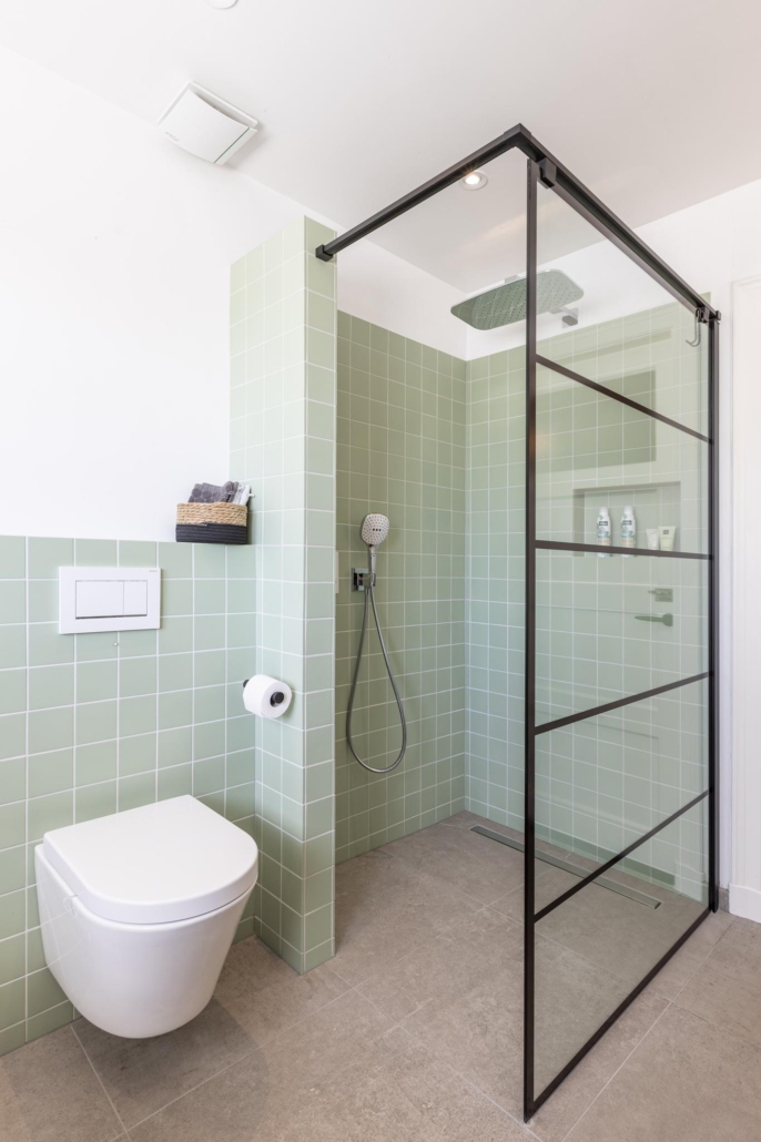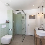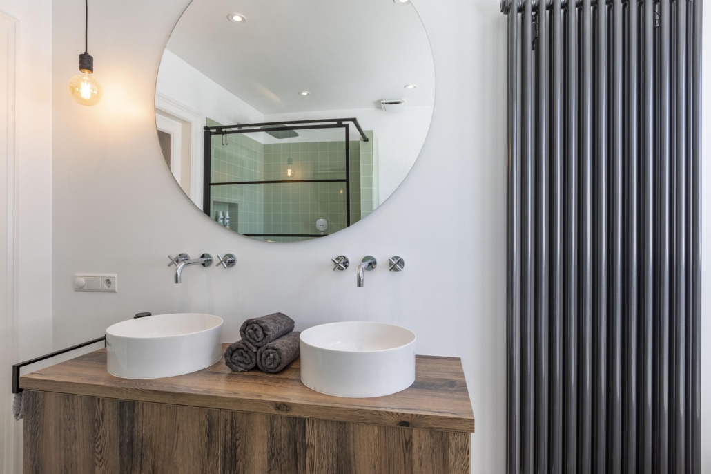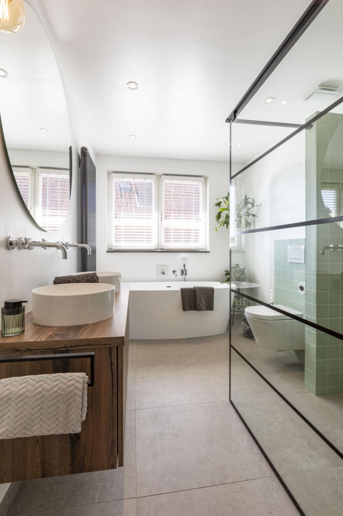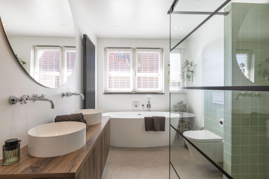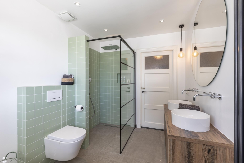 De moderne en hedendaagse badkamer is volledig betegeld en heeft een vrijstaand ovaal bad, inloopdouche, toilet en een dubbele wastafel met meubel.
