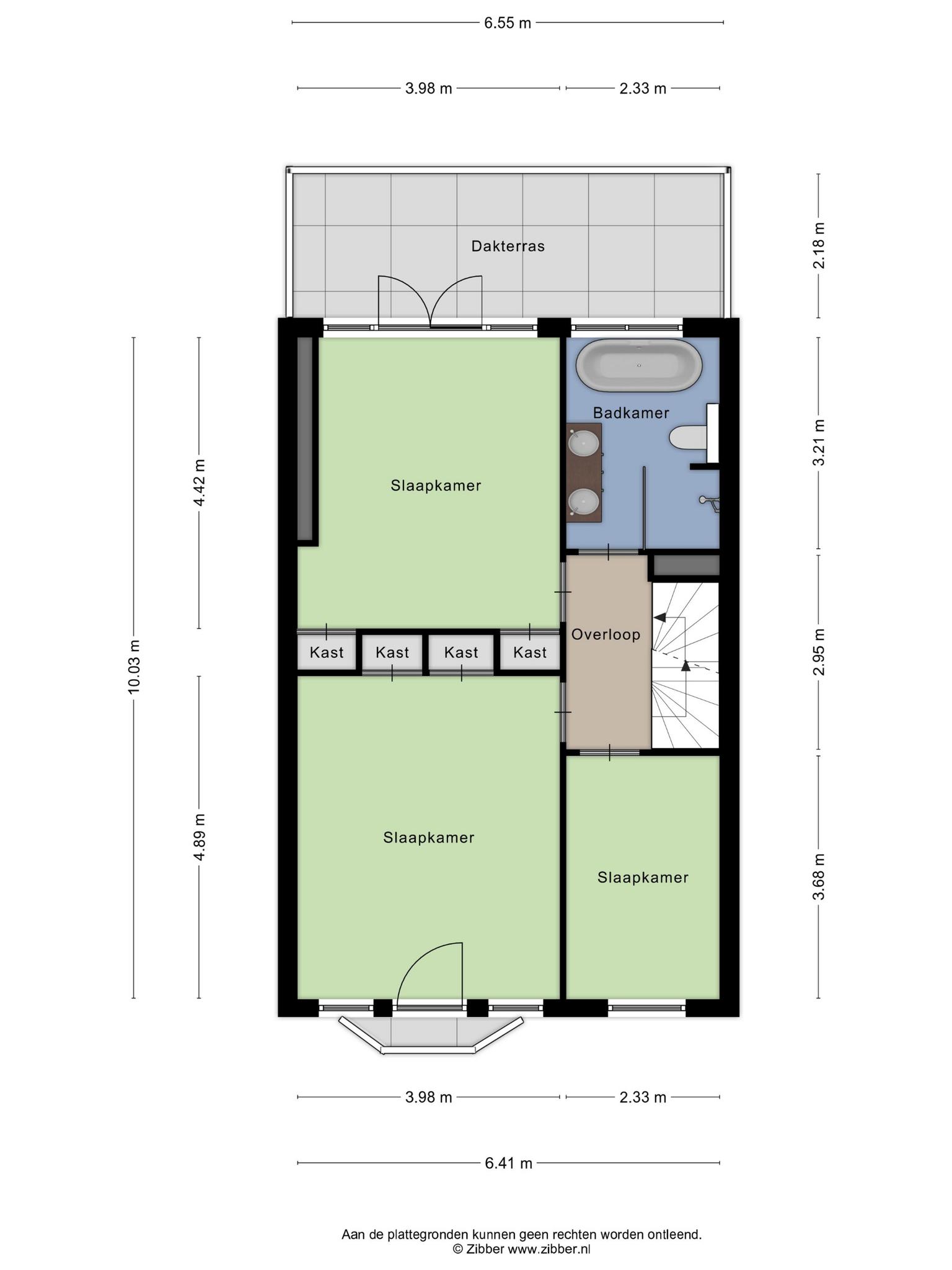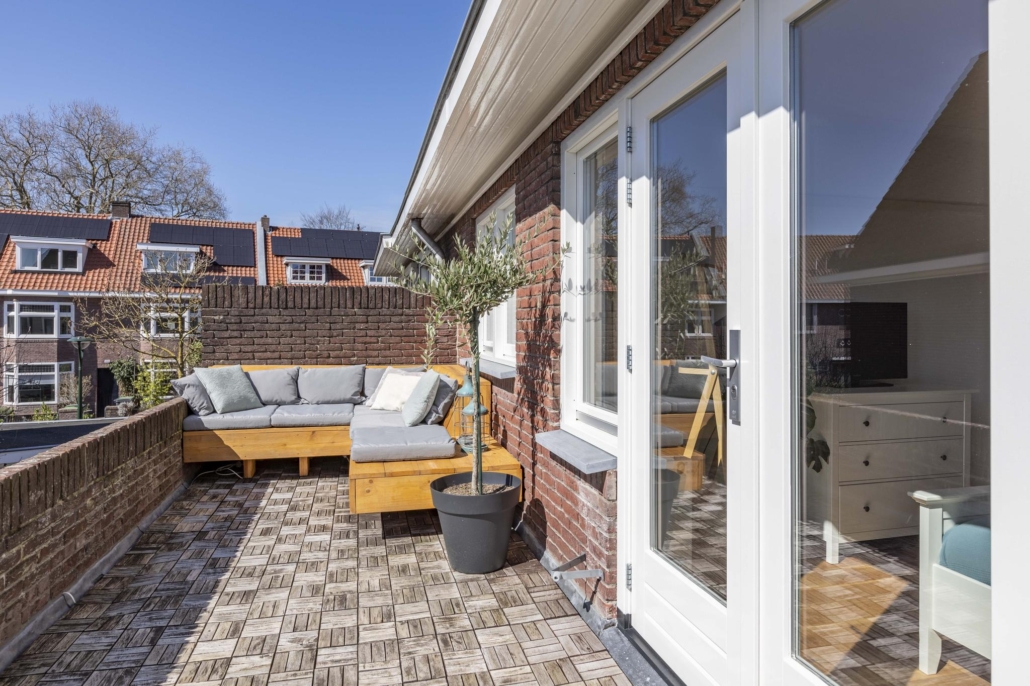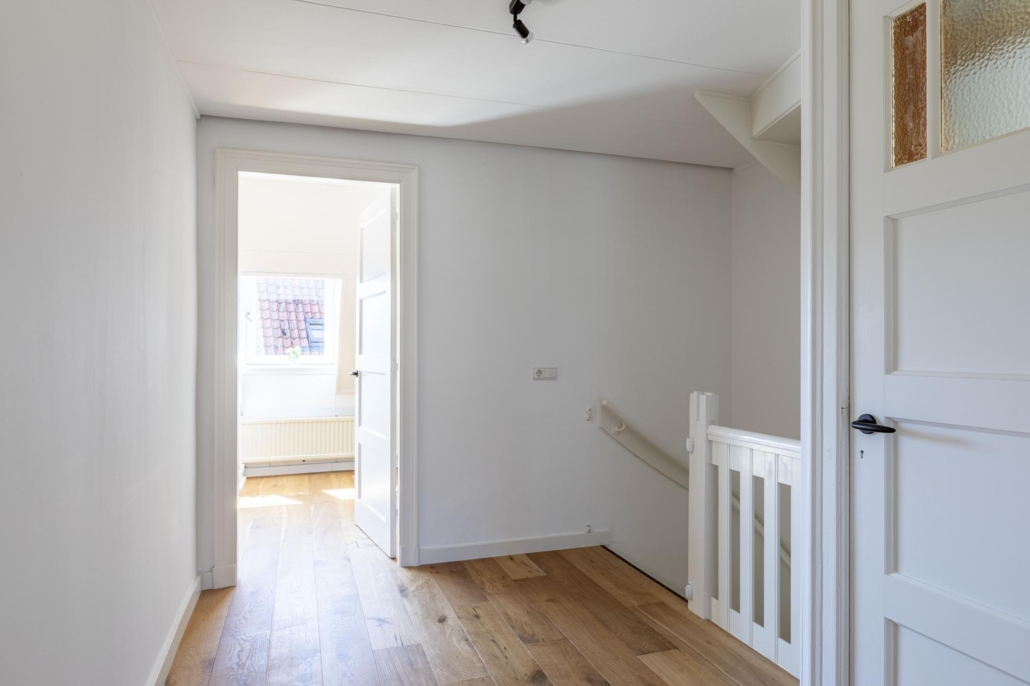 De overloop geeft toegang tot drie slaapkamers en de badkamer. De gehele verdieping is voorzien van een houten vloer met uitzondering van de badkamer. De hoofdslaapkamer aan de achterzijde van de woning is voorzien van dubbele inbouwkasten en geeft toegang tot het dakterras. Het ruime dakterras geeft de mogelijkheid om hier te genieten van de zuidwesten zon.