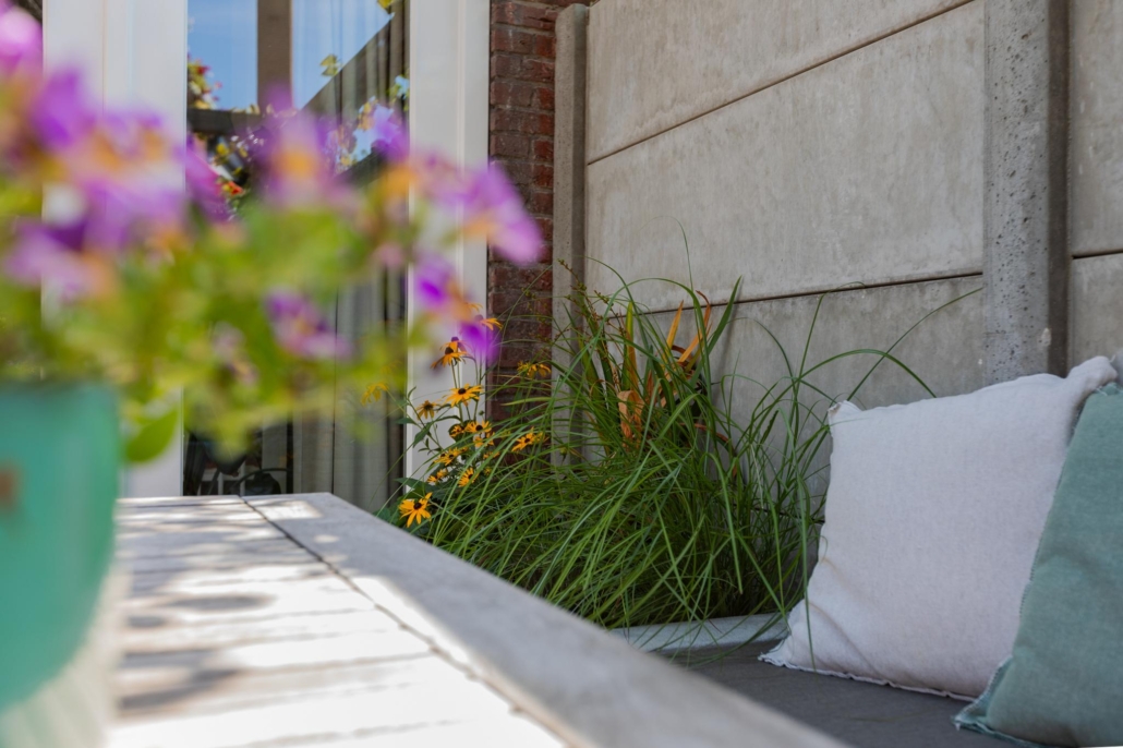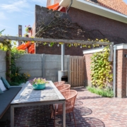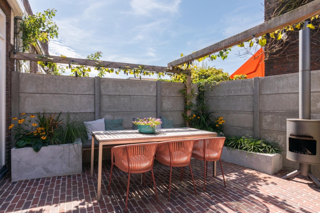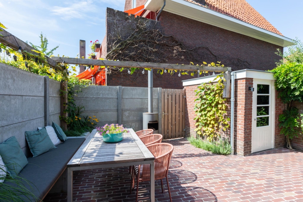 De achtertuin is gelegen op het zuidwesten en verzorgd aangelegd. De bestrating van zowel de voor- als achtertuin zijn onderhoudsvrij. Een elektrische zonneluifel zorgt voor de nodige schaduw op hete dagen. Via een achterom is er toegang tot de Potgieterstraat. Stenen berging met elektra op eigen terrein.