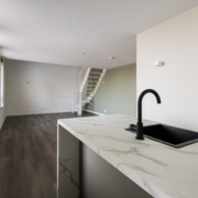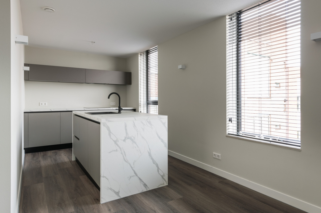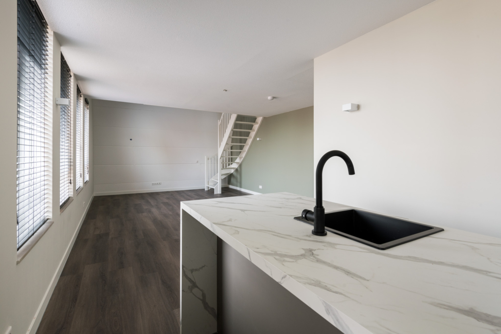 Bij binnenkomst valt direct de ruimtelijkheid op. Je loopt zo door naar de moderne keuken, voorzien van alles wat je nodig hebt: een inductiekookplaat, afzuigkap, spoelbak, vaatwasser, oven én volop kastruimte.