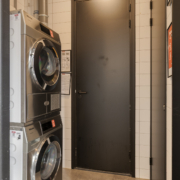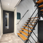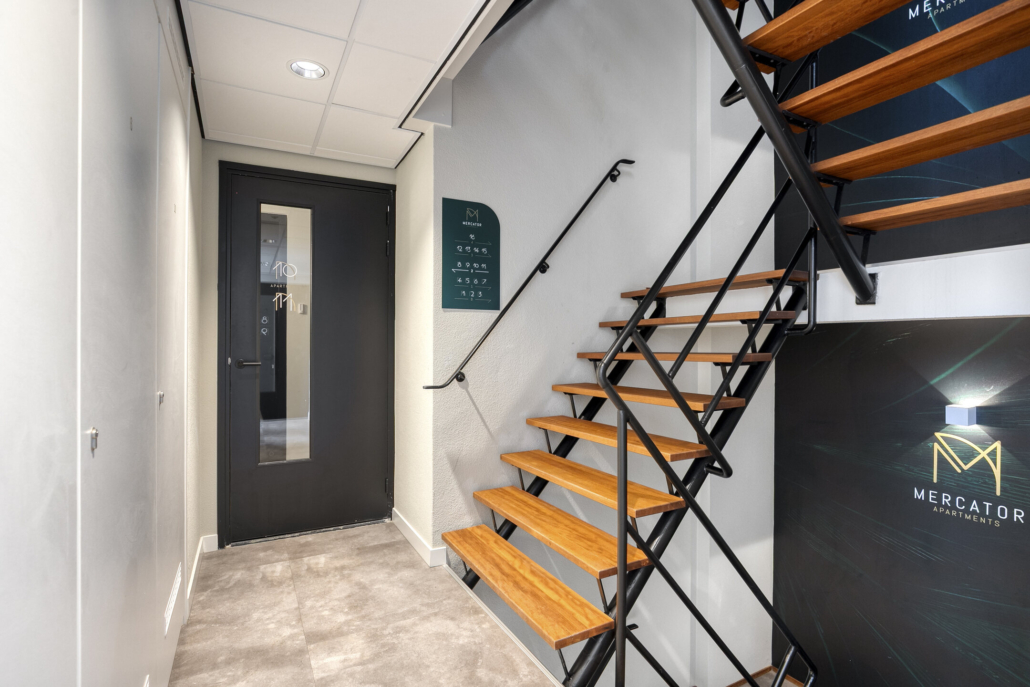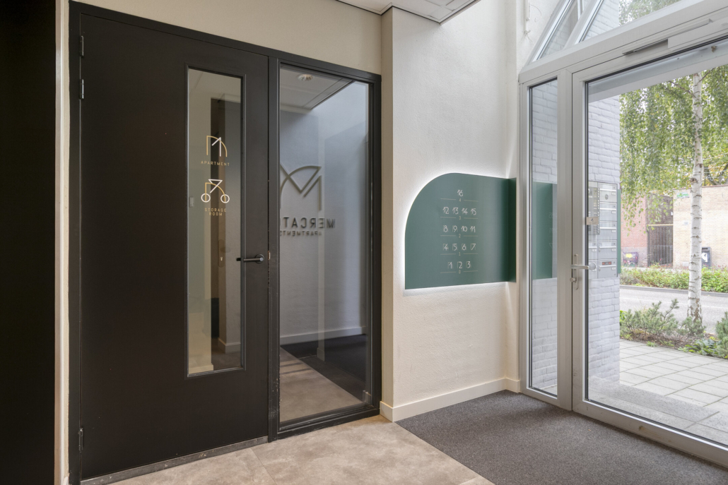 Bij binnenkomst valt meteen de frisse, lichte entree op. Hier vind je een lift en trappenhuis, maar ook een overdekte fietsenstalling en een gezamenlijke wasruimte met luxe Miele-apparatuur die je eenvoudig via een app bedient – een eigen wasmachine is dus niet nodig!