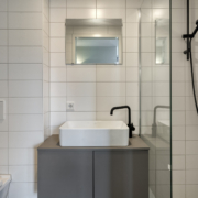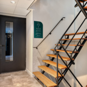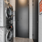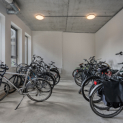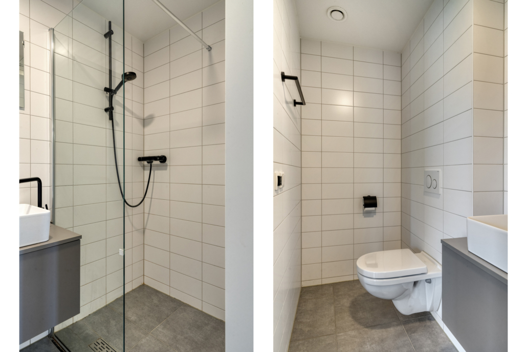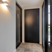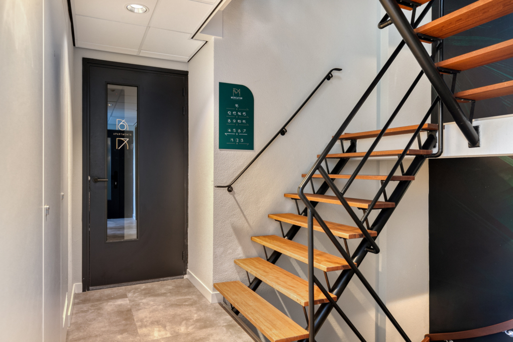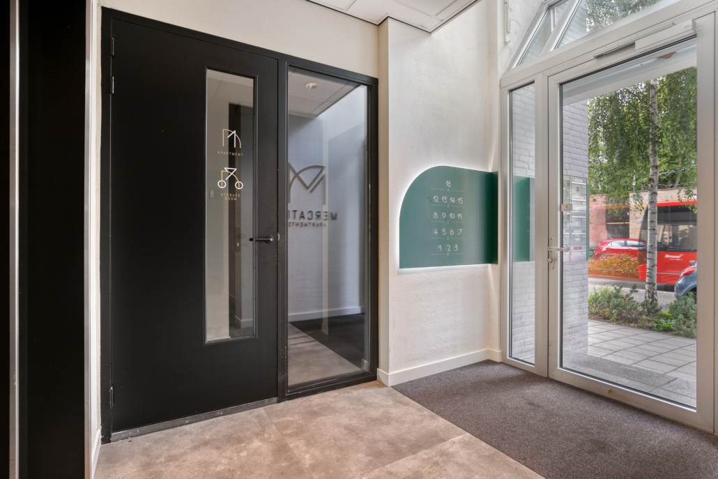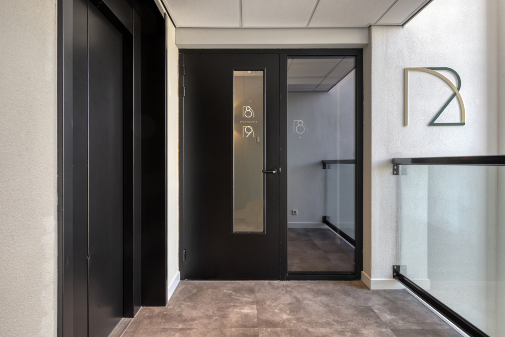 Bij binnenkomst tref je een moderne, lichte entree met toegang tot de lift, het trappenhuis, een overdekte fietsenstalling en een gezamenlijke wasruimte met Miele-apparatuur (bedienbaar via app). Je hoeft dus geen eigen wasmachine aan te schaffen.