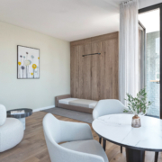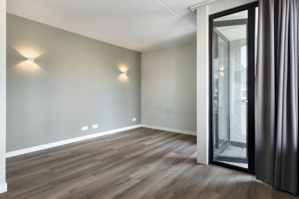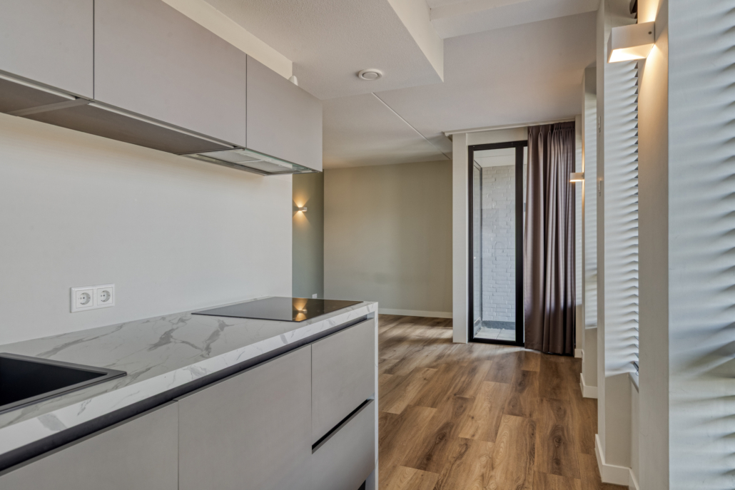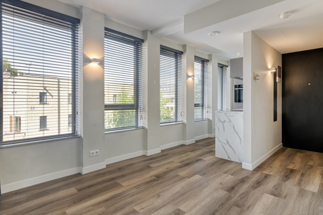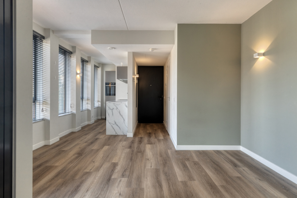 Je komt direct binnen in het leefgedeelte. De woonkamer is bijzonder licht dankzij de grote ramen aan de zonnige zijde. Dankzij de praktische indeling is de ruimte gemakkelijk naar wens in te richten. Er is sfeervolle wandverlichting aanwezig en je kijkt rustig uit over het bruisende Eindhoven. Op de loggia kun je heerlijk buiten zitten.