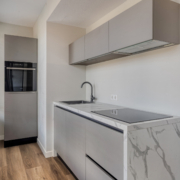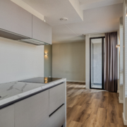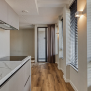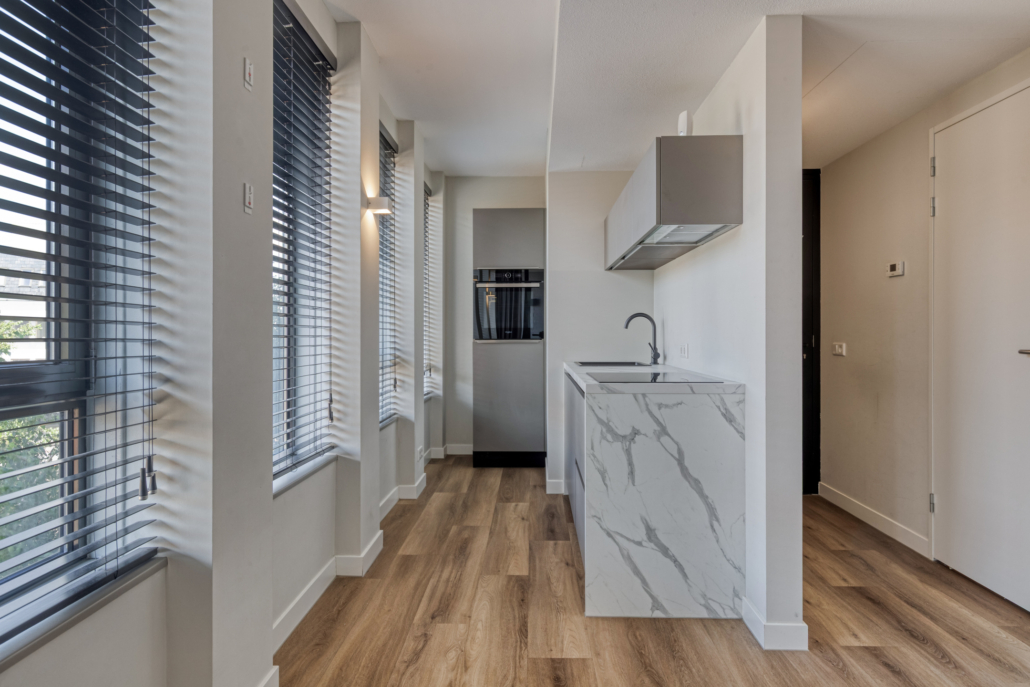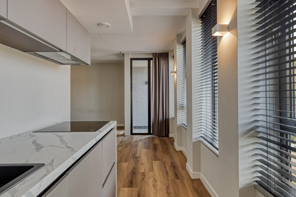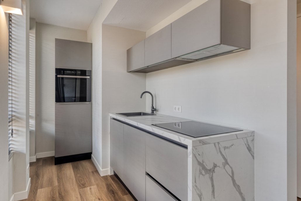 De moderne keuken is voorzien van een strak keukenblok met inductiekookplaat, afzuigkap, spoelbak, vaatwasser en oven. De gehele woning is voorzien van een onderhoudsvriendelijke PVC-vloer (met vloerverwarming en vloerkoeling voor de zomers)