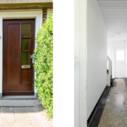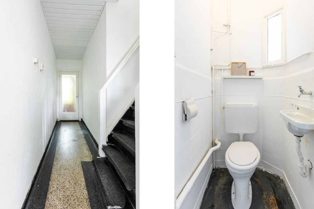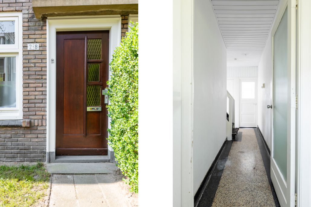 Via de ruime voortuin bereik je de entree van de woning. Je komt binnen in een voorportaal met meterkast, waarna een glazen deur toegang geeft tot de centrale hal. Vanuit hier zijn de woonkamer, keuken, toiletruimte en de trap naar de verdieping bereikbaar. De originele terrazzo vloer is hier nog aanwezig en loopt door tot in de keuken.