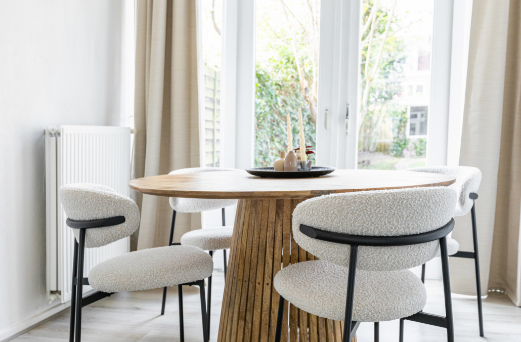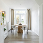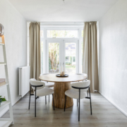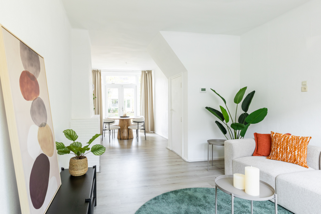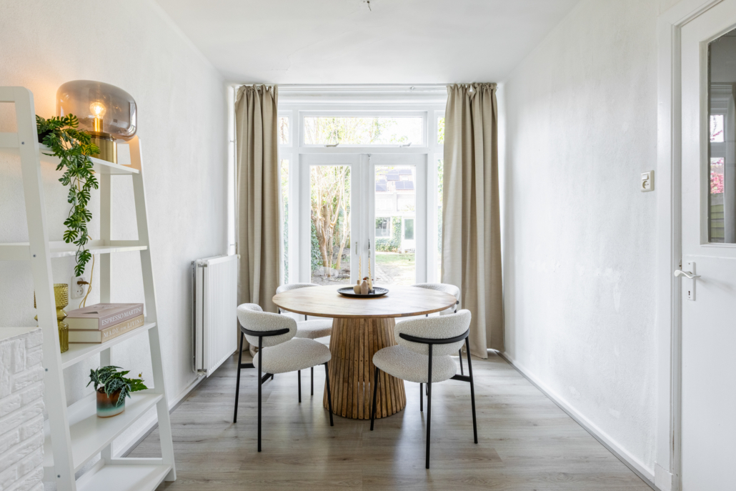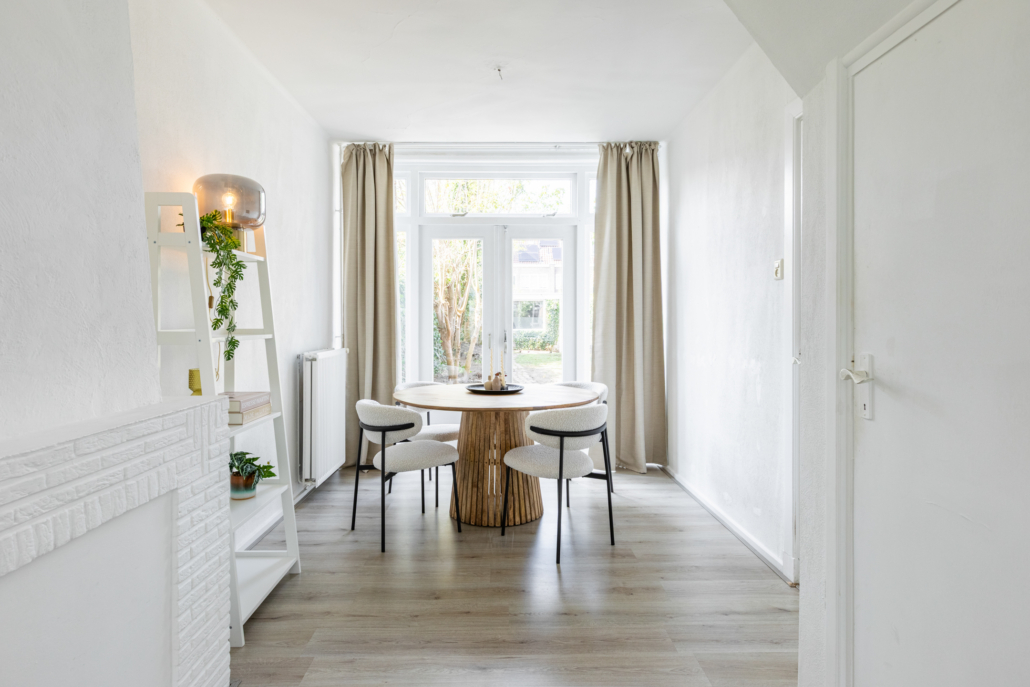 De ruimte is afgewerkt met een neutrale laminaatvloer en biedt voldoende plek voor zowel een comfortabele zithoek als een ruime eethoek.