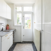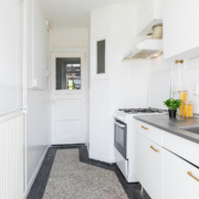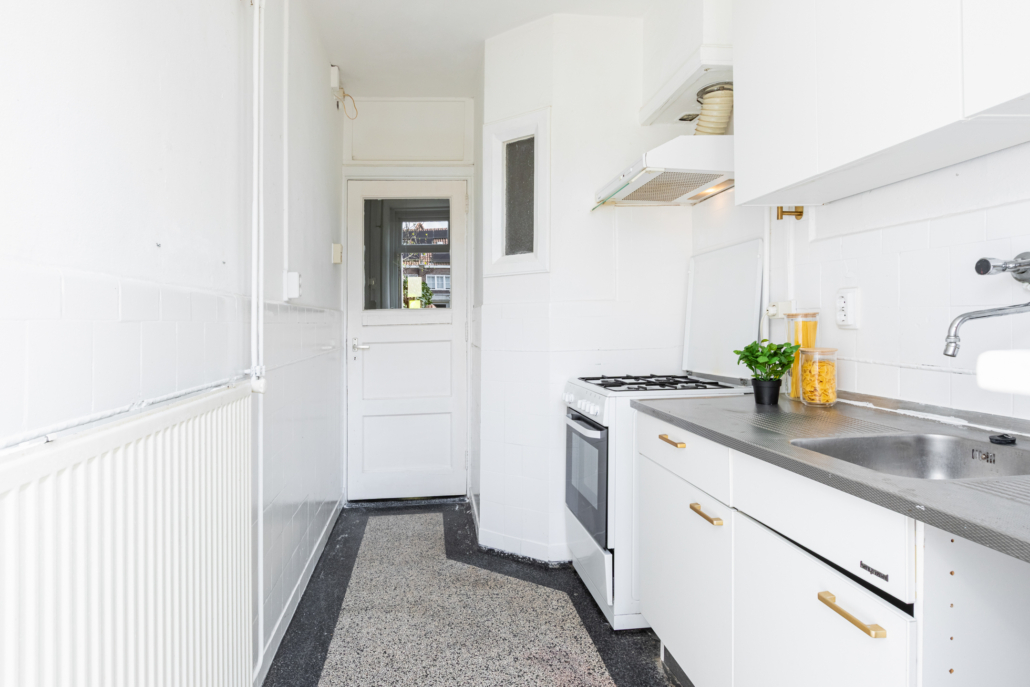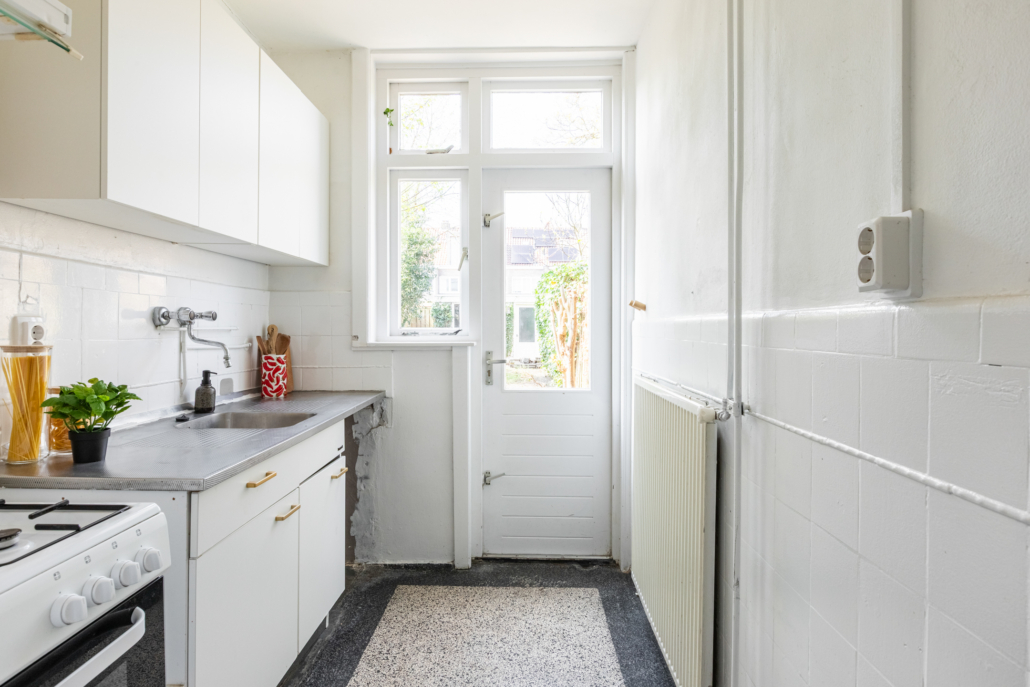 De keuken is eenvoudig van opzet. Dankzij de achterpui met raam en deur naar de tuin geniet de ruimte van veel natuurlijke lichtinval. Verder is de keuken voorzien van een gaskooktoestel en een afzuigkap.