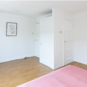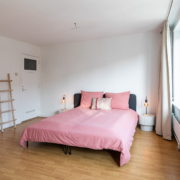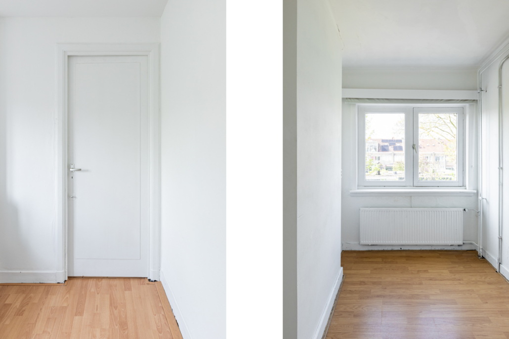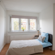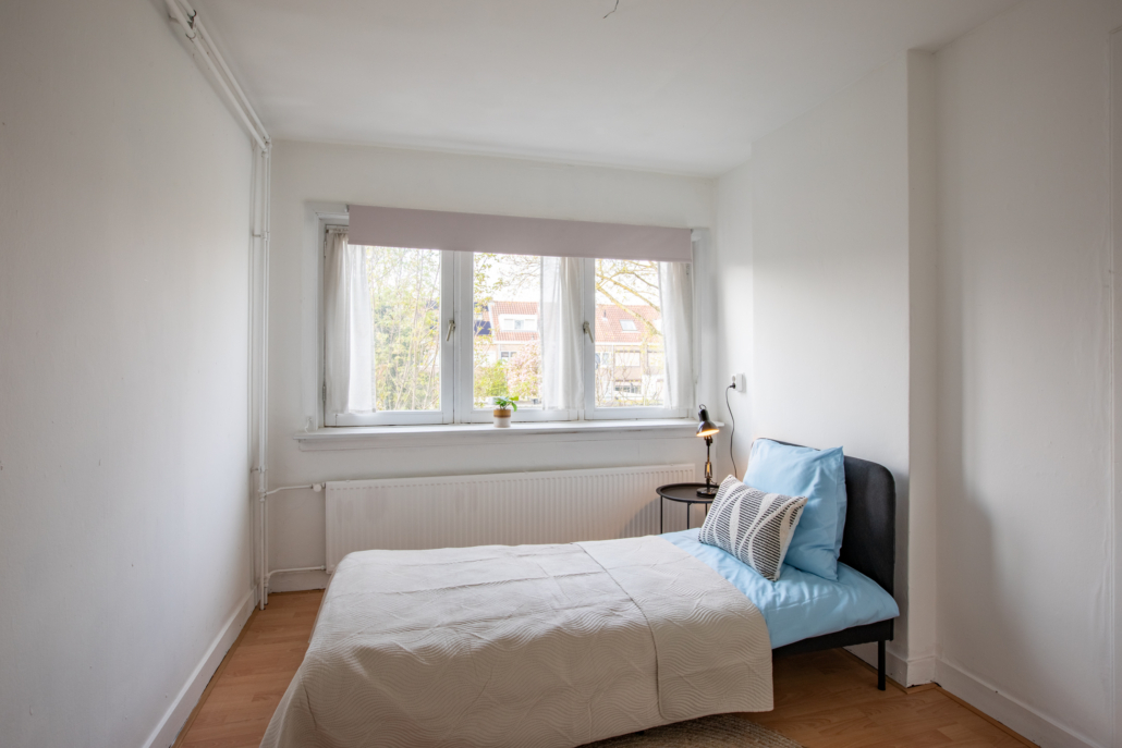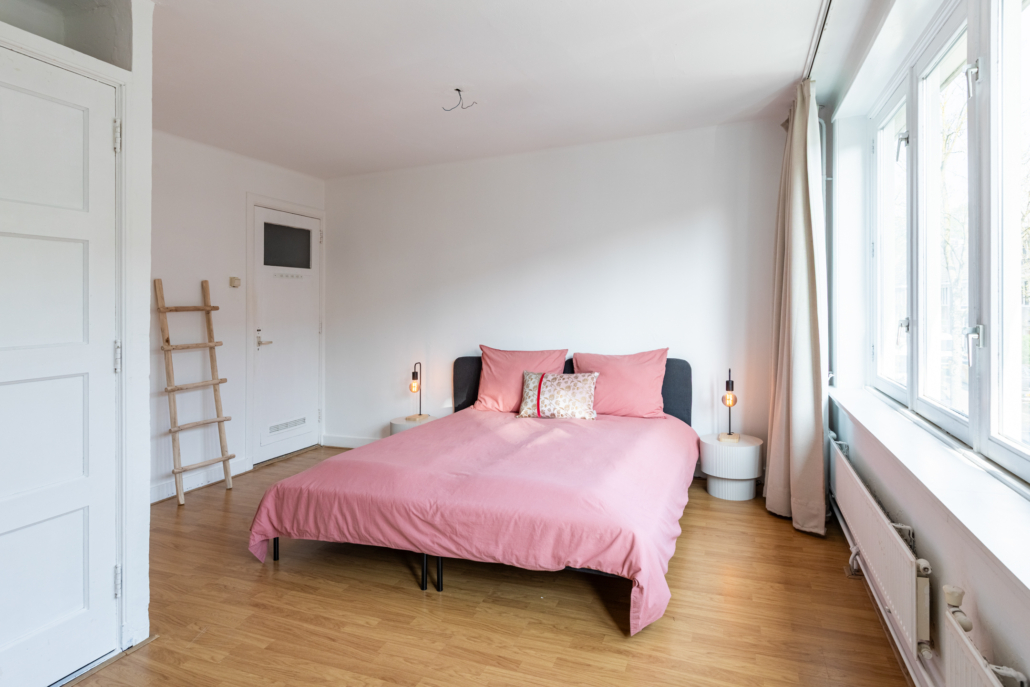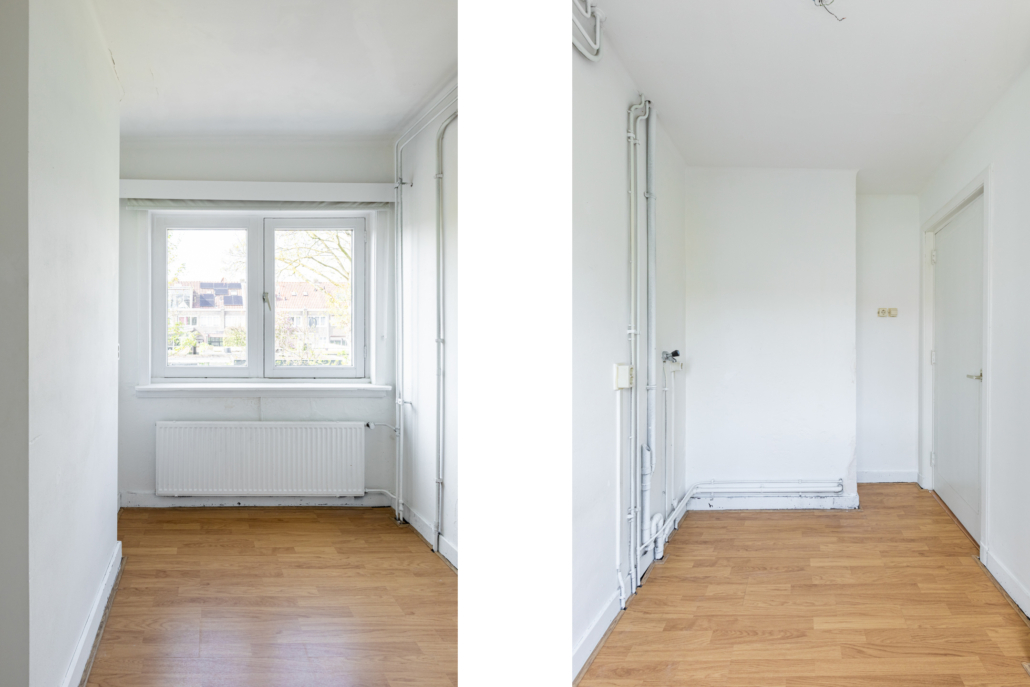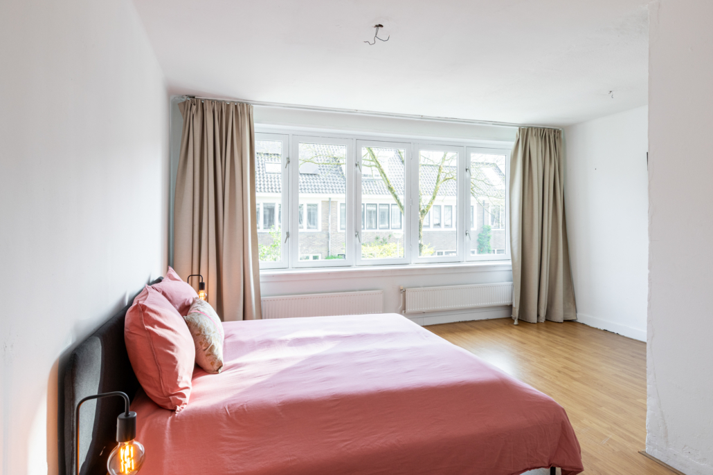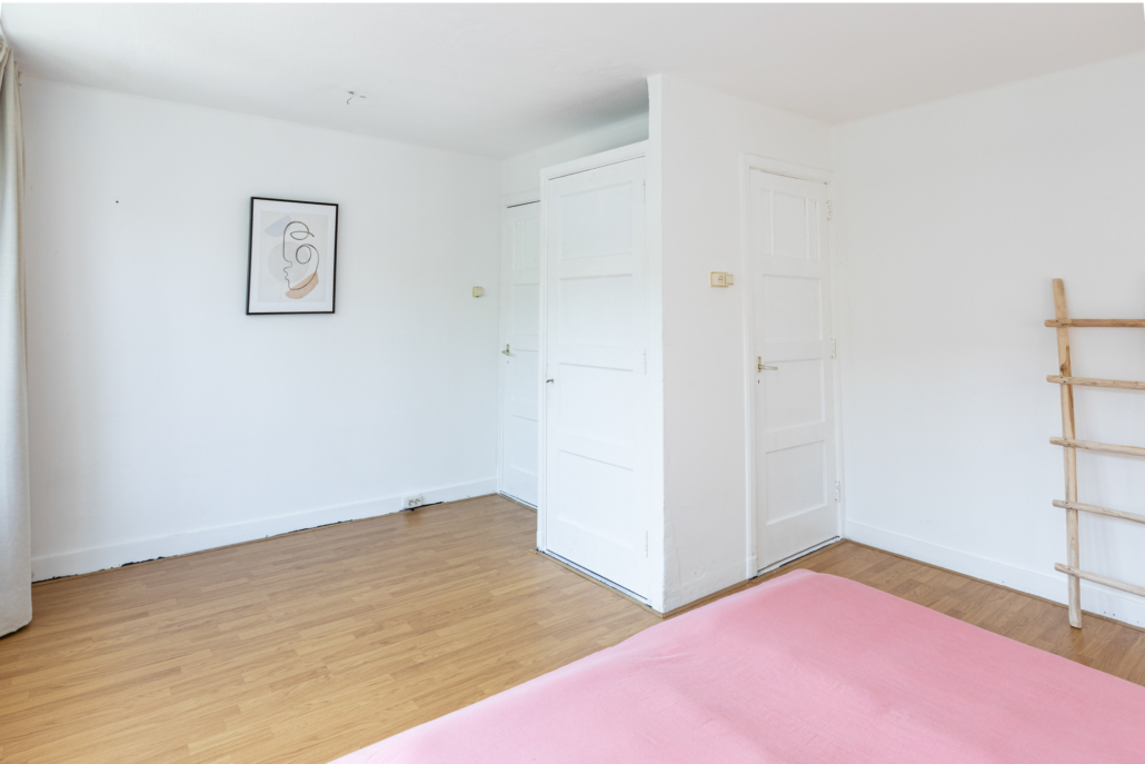 Aan de voorzijde bevindt zich een verrassend ruime slaapkamer over de volledige breedte van de woning, eveneens met grote ramen en een praktische inbouwkast. Deze ruimte biedt de mogelijkheid om eenvoudig te worden opgesplitst in twee slaapkamers; de deuren vanuit de hal zijn hiervoor al aanwezig.
