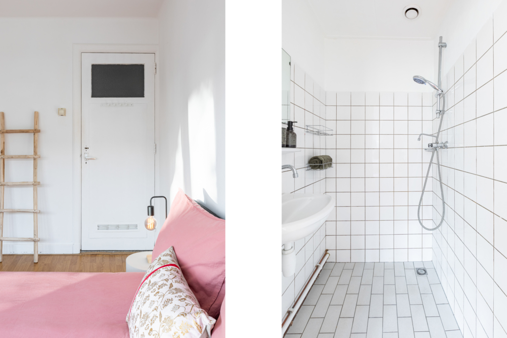 De badkamer is vanuit deze slaapkamer bereikbaar en is functioneel ingericht met een douche en wastafel.