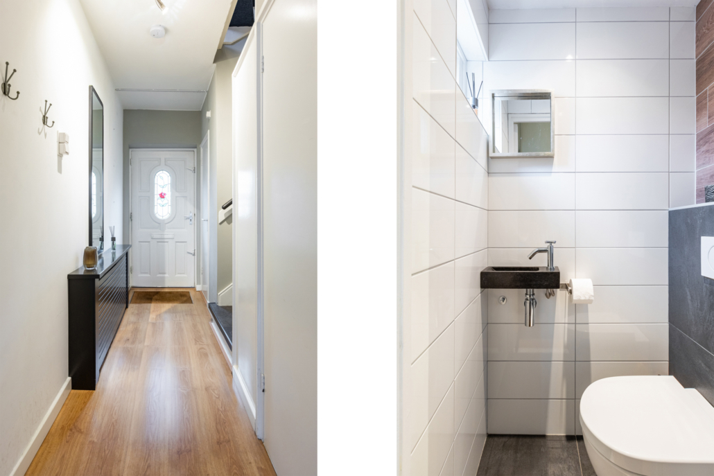 We lopen langs een verzorgde voortuin naar de voordeur van deze woning. In de hal is toegang tot de woonkamer, de gemoderniseerde toiletruimte met raampje, praktische trapkast, meterkast en trapopgang naar verdieping.