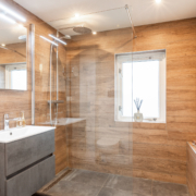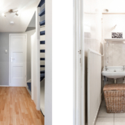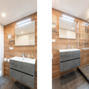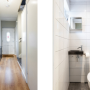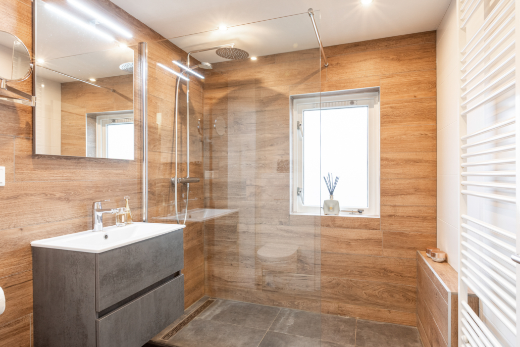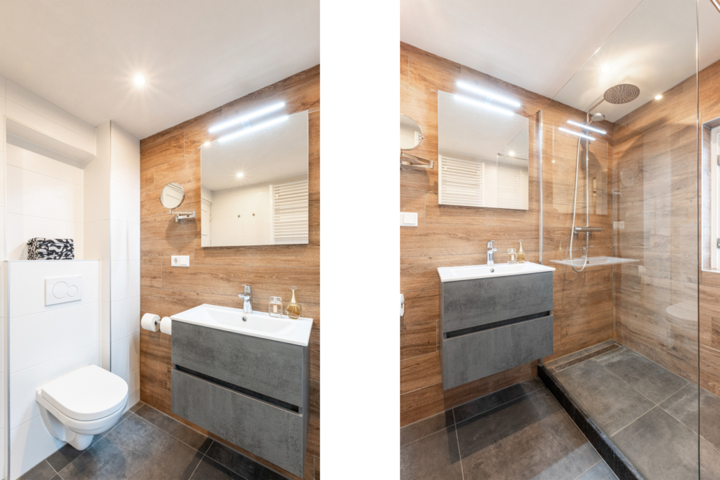 De volledig gemoderniseerde badkamer heeft een toilet, wastafelmeubel, designradiator en grote ruime inloopdouche. Daarnaast is er een groot raam voor daglicht en luchttoetreding. Van de oorspronkelijke kleinere badkamer aan de voorzijde is een praktische wasruimte gemaakt met nog een wastafel en raam.