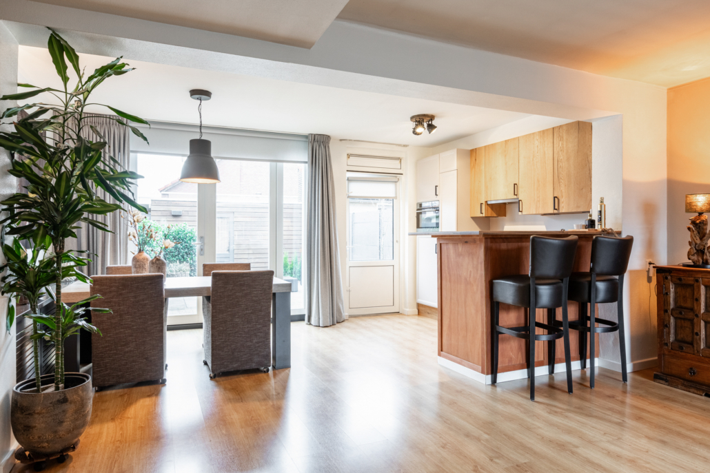 Een tijdloze laminaatvloer ligt over de hele begane grond.