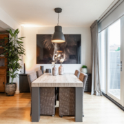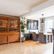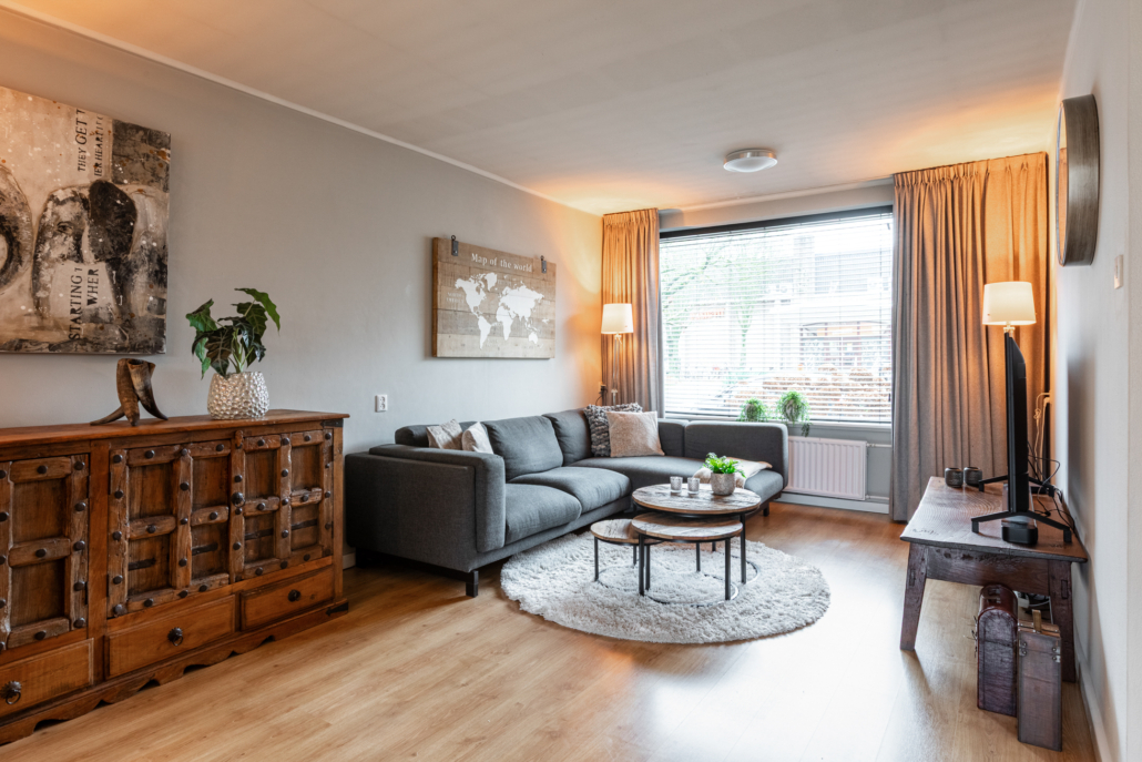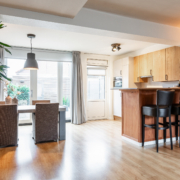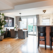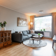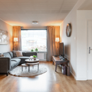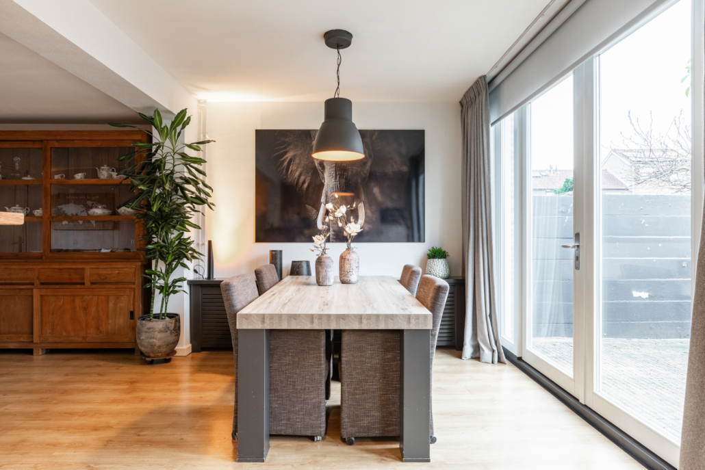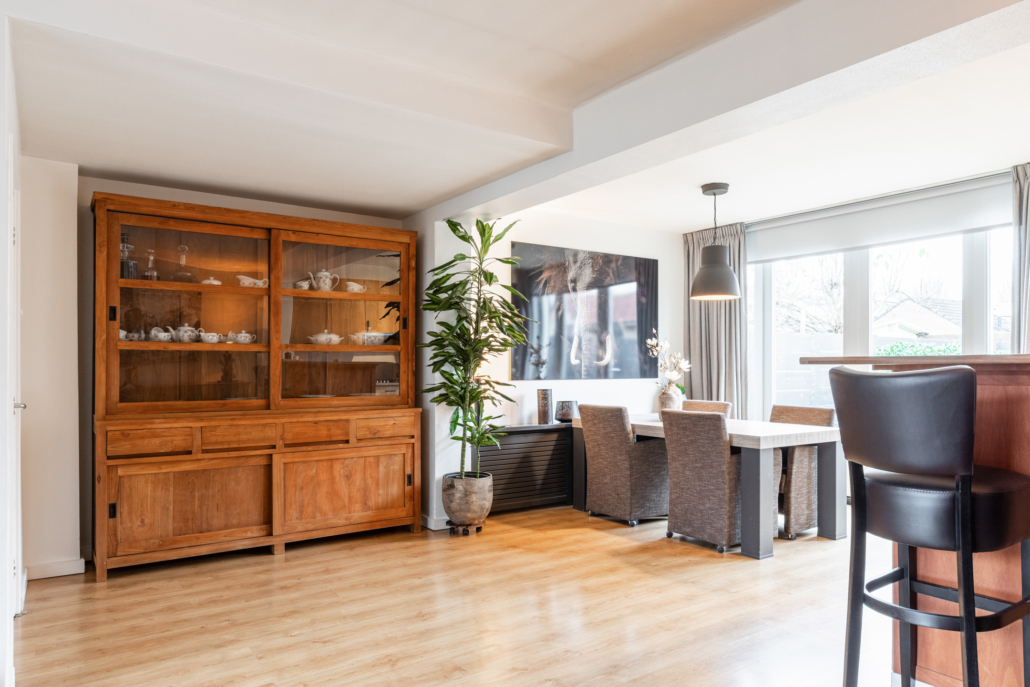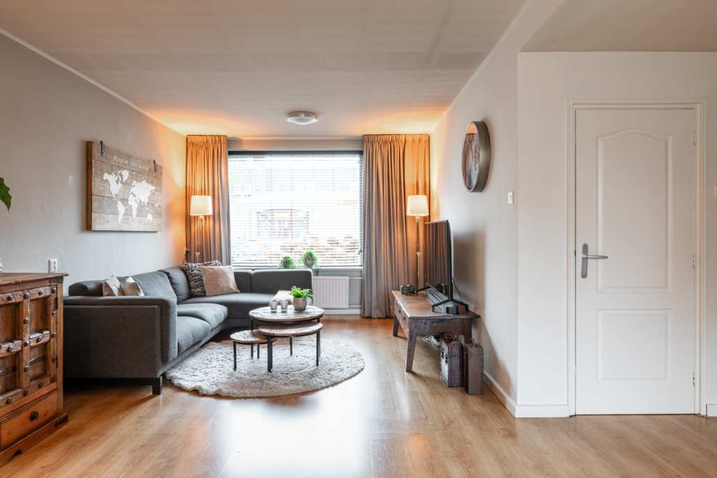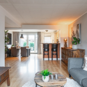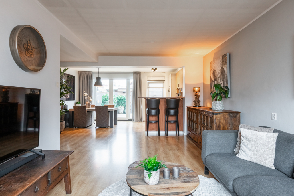De woonkamer is ruim van opzet. Als we binnenkomen kijken we gelijk door naar de nieuwe openslaande tuindeuren aan de achterzijde. Deze pui is over de gevel breedte voorzien van glas en kijkt daardoor prettig uit over de achtertuin.