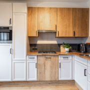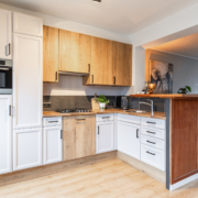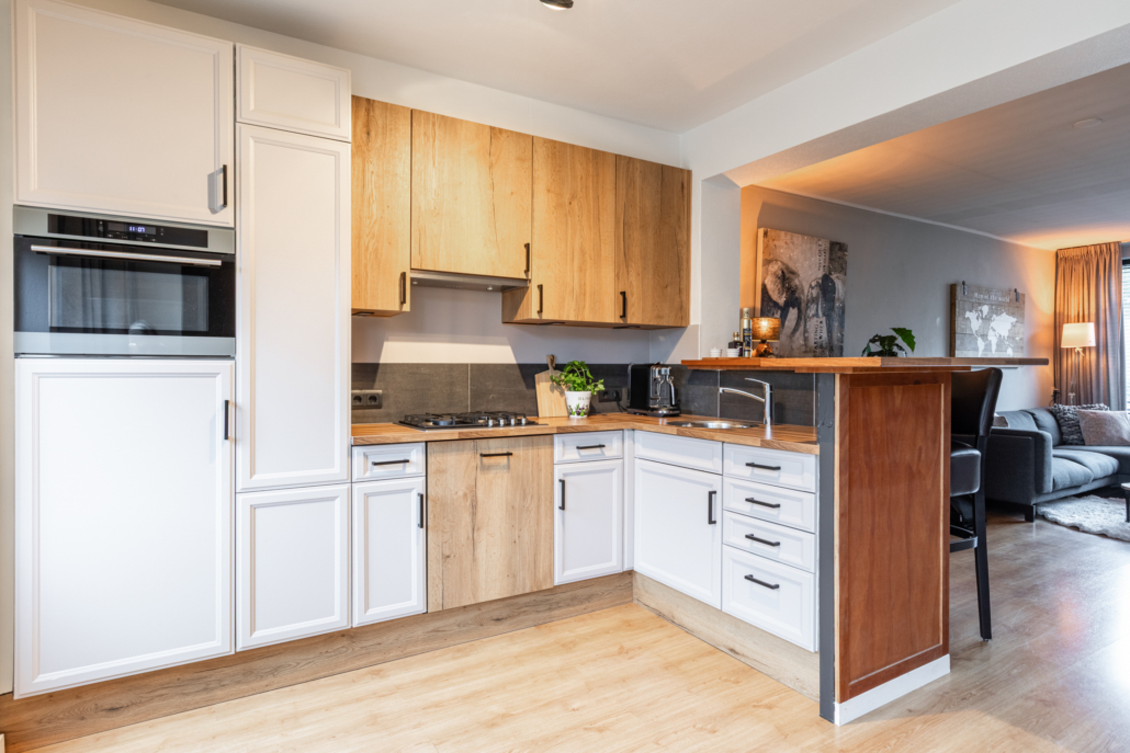 De frisse verzorgde open keuken is van alle gemakken voorzien en heeft een vaatwasser, koelkast, combi-magnetron, gaskookplaat en apothekerskast. Het heeft een hoekopstelling waarbij een speelse zithoek/bargedeelte is gecreëerd waardoor er zowel een praktische scheiding met de woonkamer is, alsmede een gezellig zithoekje is ontstaan.