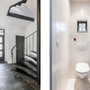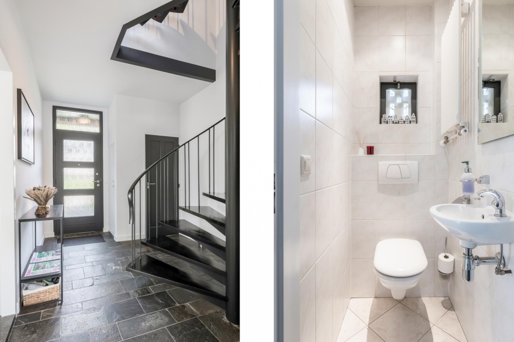 Zodra je binnenstapt in de lichte hal valt de verzorgde afwerking op. Een lichte hal met leistenen vloer, strak gestucte wanden, de meterkast, toiletruimte met fonteintje en buitenraampje en (wentel)trap naar de eerste verdieping.