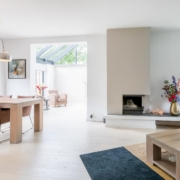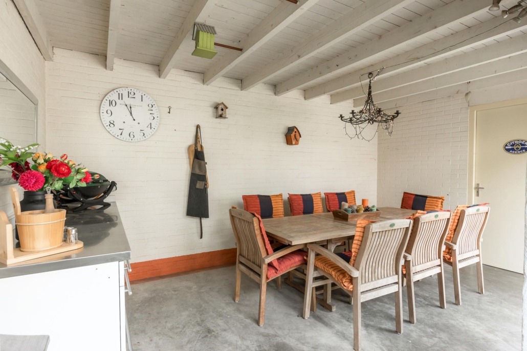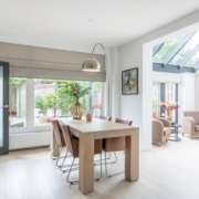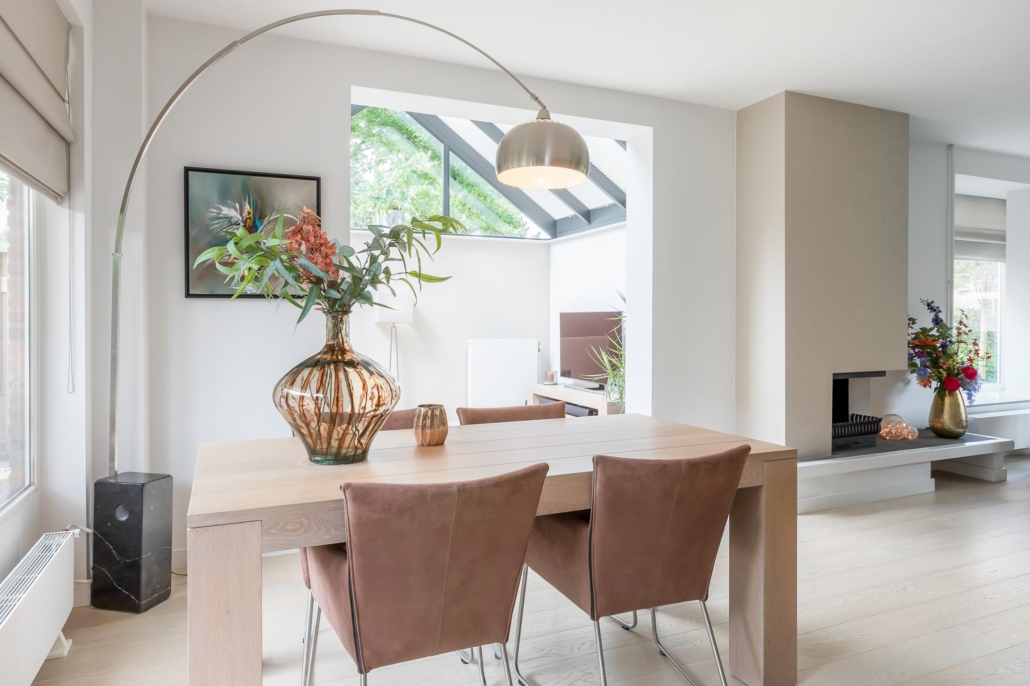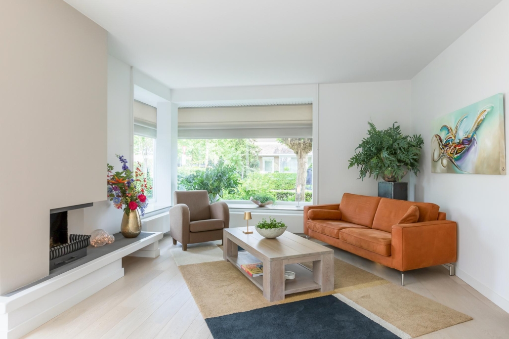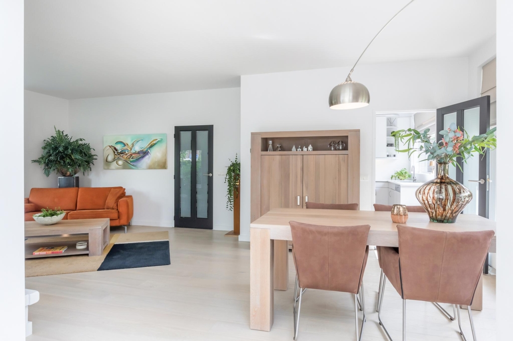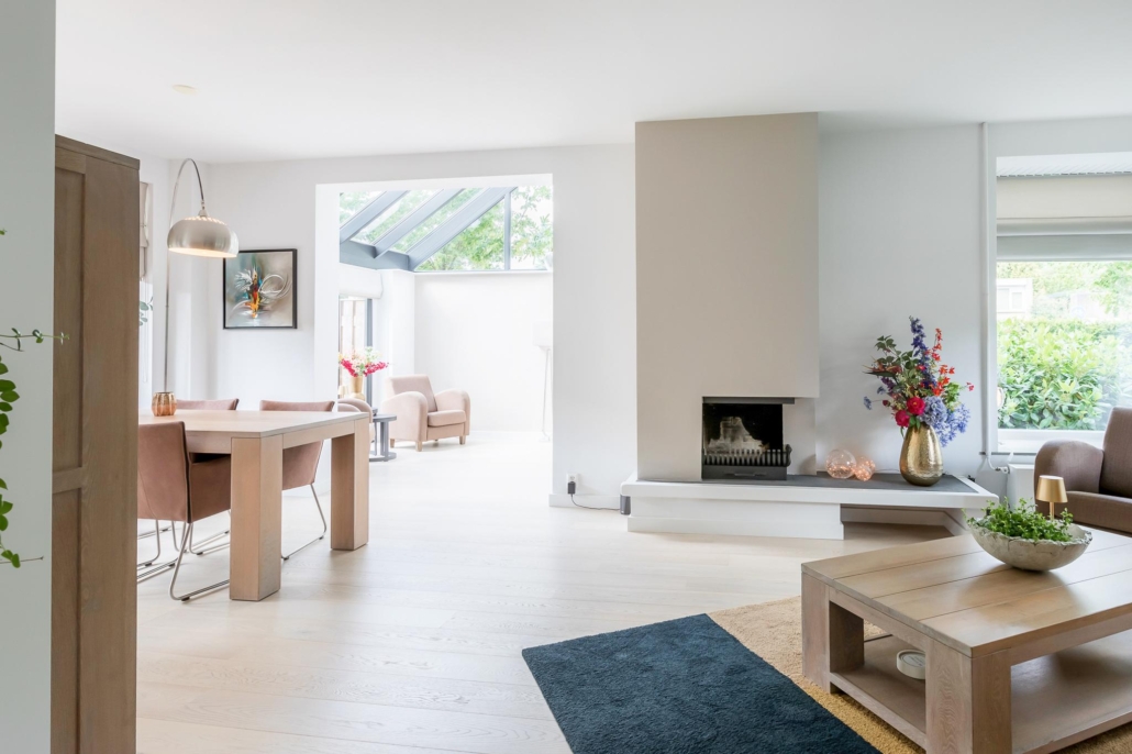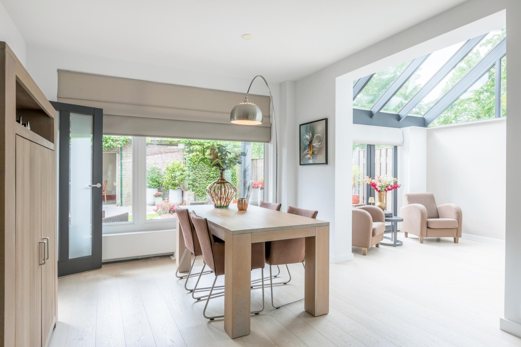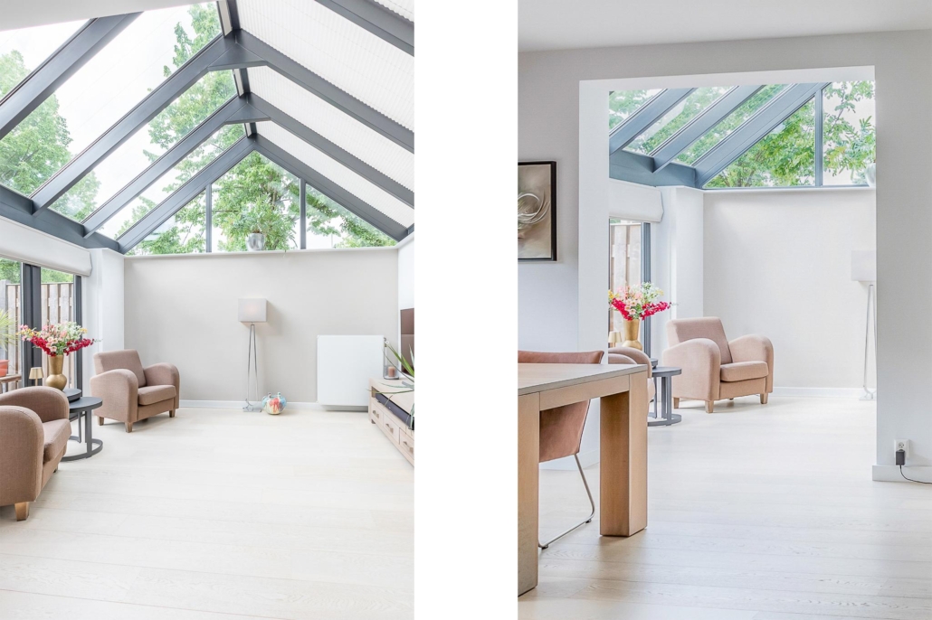 Bij het binnenstappen van de woonkamer word je direct getrokken naar de fantastische, serre-achtige uitbouw aan de zijkant van de woning. Het puntdak van deze uitbouw is volledig van glas (voorzien van zonwering) en geeft samen met de openslaande deuren aan de tuinzijde en raam aan voorzijde het gevoel van ruimte en licht. Voor de warme dagen is airconditioning aanwezig zodat het hier altijd aangenaam vertoeven is.