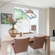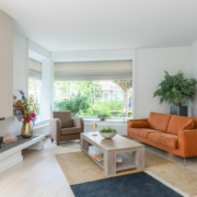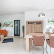 Circa vier jaar geleden is de woonkamer gemoderniseerd door nieuw strak stucwerk en een frisse houten vloer. Aan de voorzijde van de woonkamer hebben we heerlijk vrij uitzicht door de grote hoek-erker met grote raampartijen. Door de speelse indeling biedt de woonkamer volop mogelijkheden voor meerdere zit- en leefhoeken, er is voor iedereen plek.