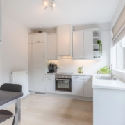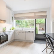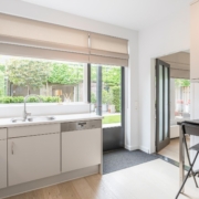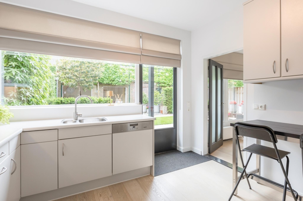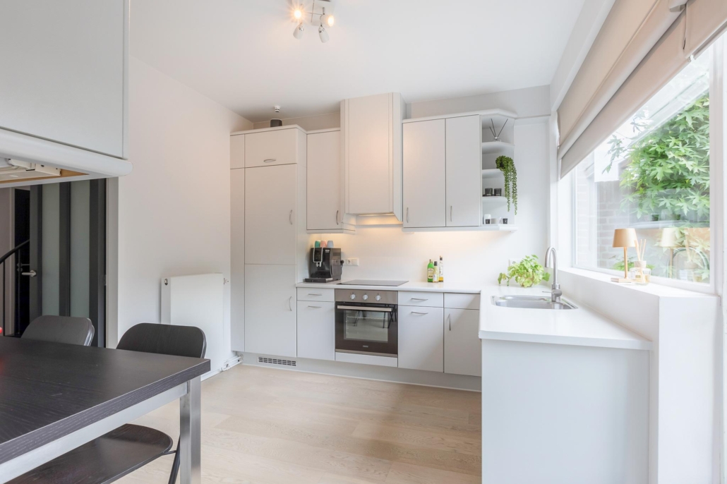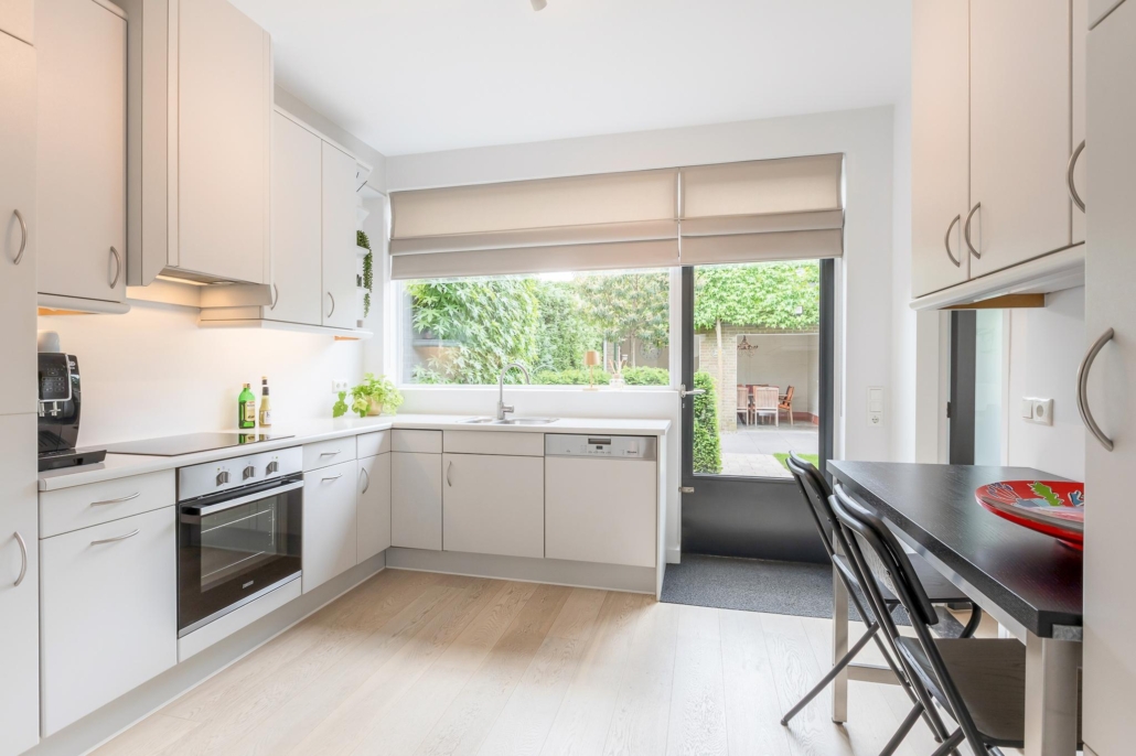Vanuit de woonkamer (eveneens vanuit de hal) is er toegang tot de lichte keuken. Deze frisse functionele keuken heeft boven het aanrecht een groot raam met heerlijk tuinzicht. De keuken is uitgerust met een inductiekookplaat, oven, koelkast, vaatwasser en biedt toegang tot de tuin via een achterdeur.