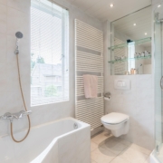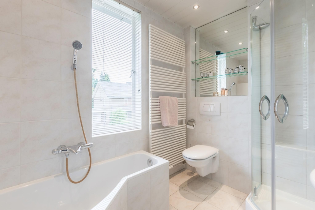 De badkamer is volledig uitgerust met een ligbad, douche, toilet en een raam voor natuurlijke ventilatie.