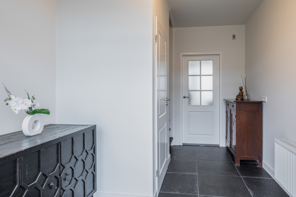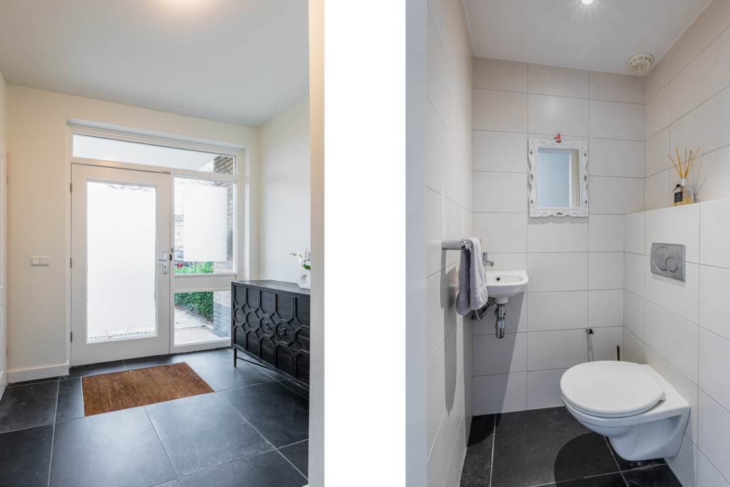 Via de verzorgd aangelegde voortuin bereikt u de entree. Ruime hal met modern toilet en trapopgang naar de verdieping.