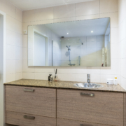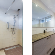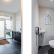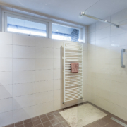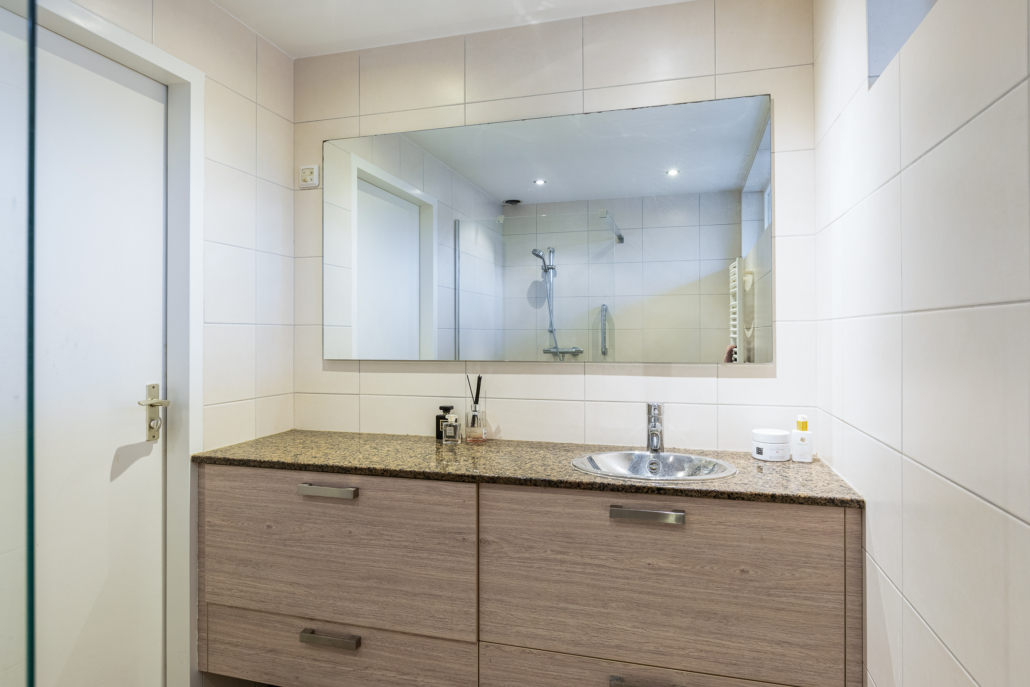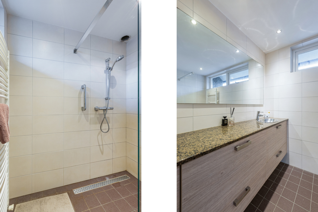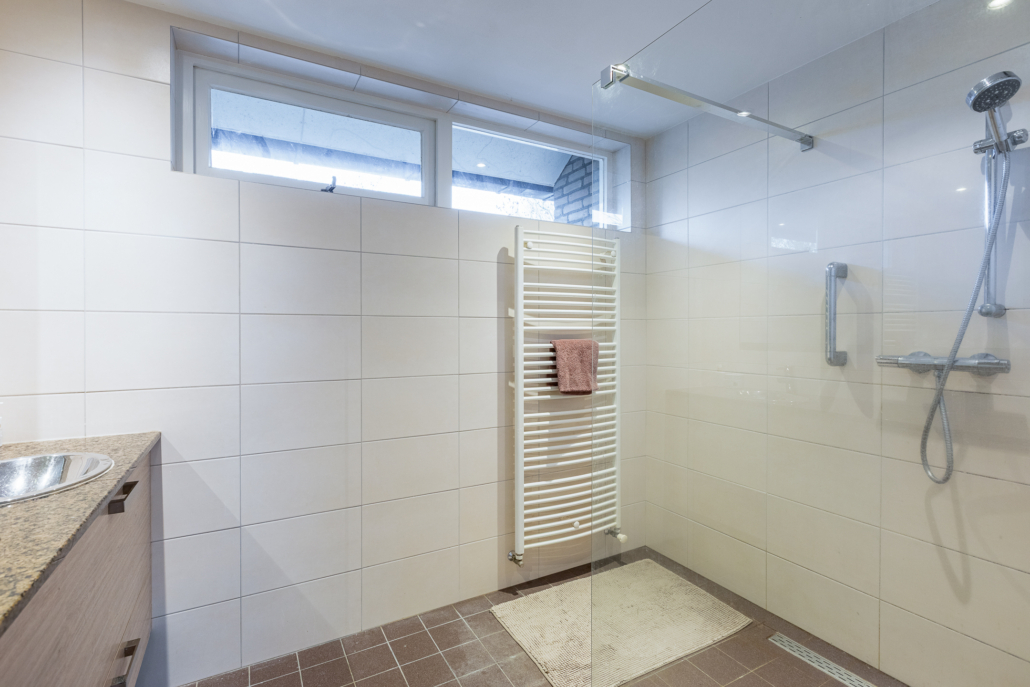 De badkamer is volledig betegeld en voorzien van een ruime inloopdouche en wastafel met meubel. Op de eerste verdieping bevindt zich een separate, volledig betegelde toiletruimte met toilet.