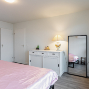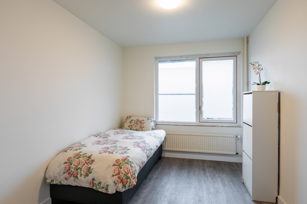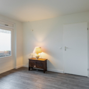 Twee slaapkamers zijn aan de achterzijde van de woning gelegen en één daarvan beschikt over praktische inbouwkasten. De badkamer en de derde slaapkamer zijn aan de voorzijde gelegen. De slaapkamer biedt toegang tot het balkon.