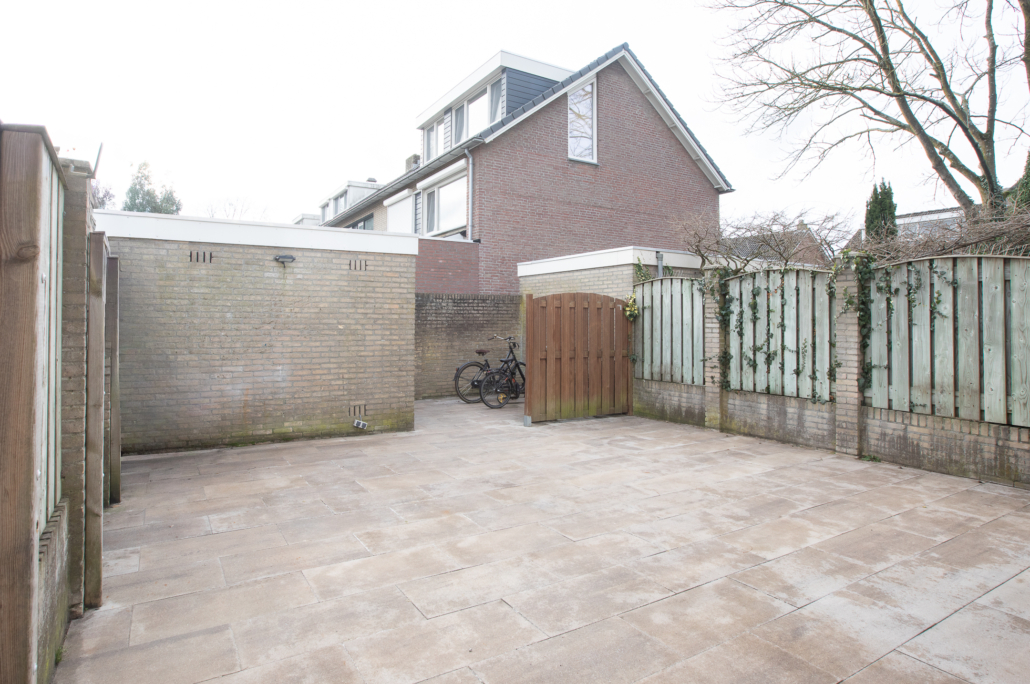 De zonnige tuin op het zuiden beschikt is praktisch ingericht met een eigen achterom. De berging is voorzien van elektra en is circa 8m² groot.