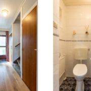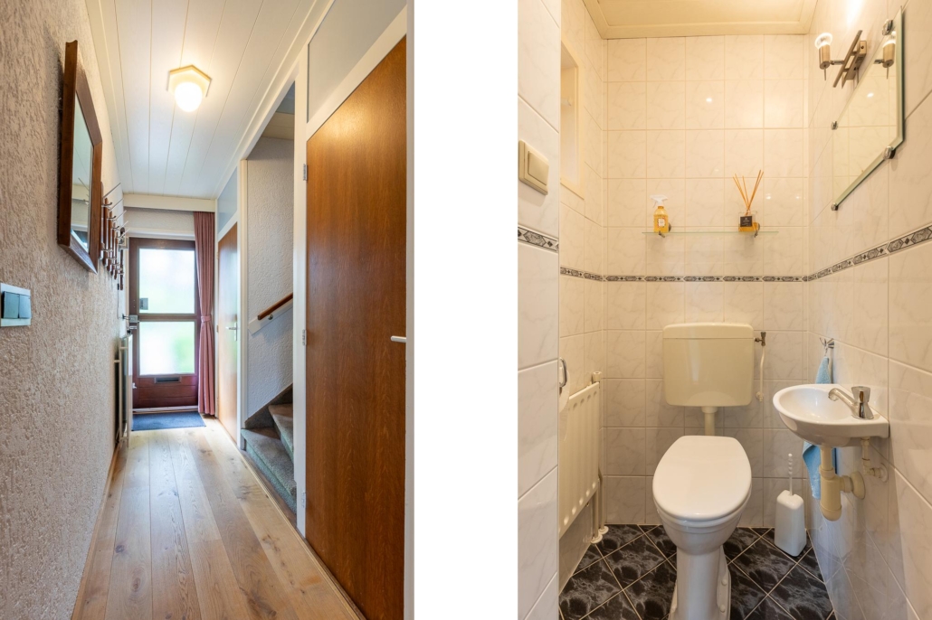 Via een verzorgde voortuin komen we bij de (deels) overdekte entree. In de hal is toegang tot de verzorgde toiletruimte, de provisieruimte met de meterkast onder de trap en de woonkamer.