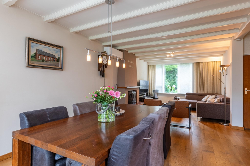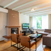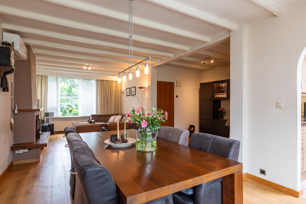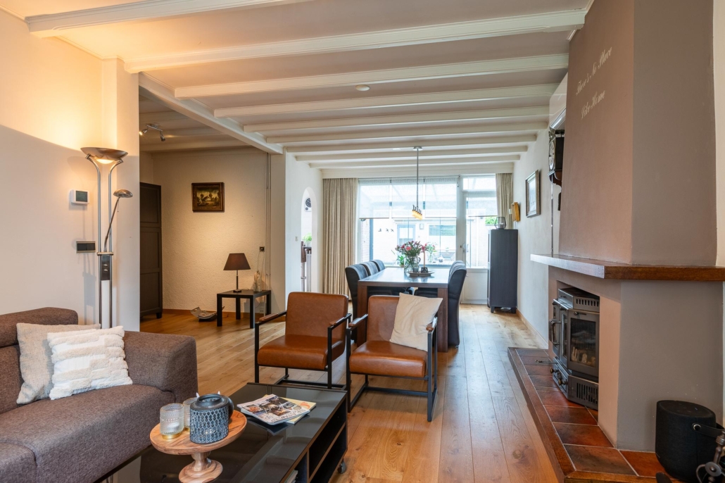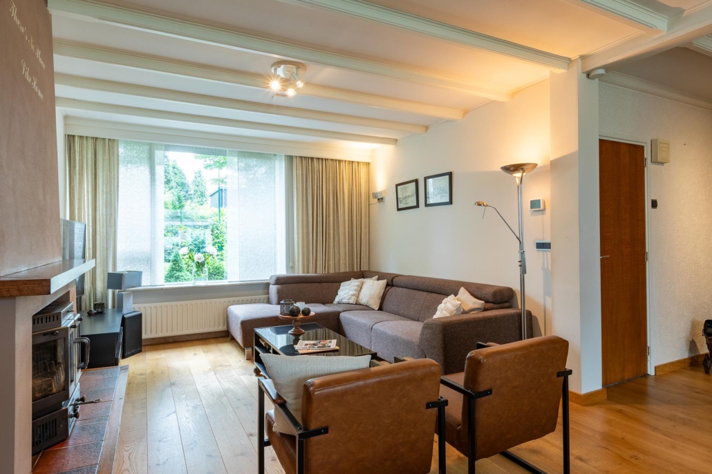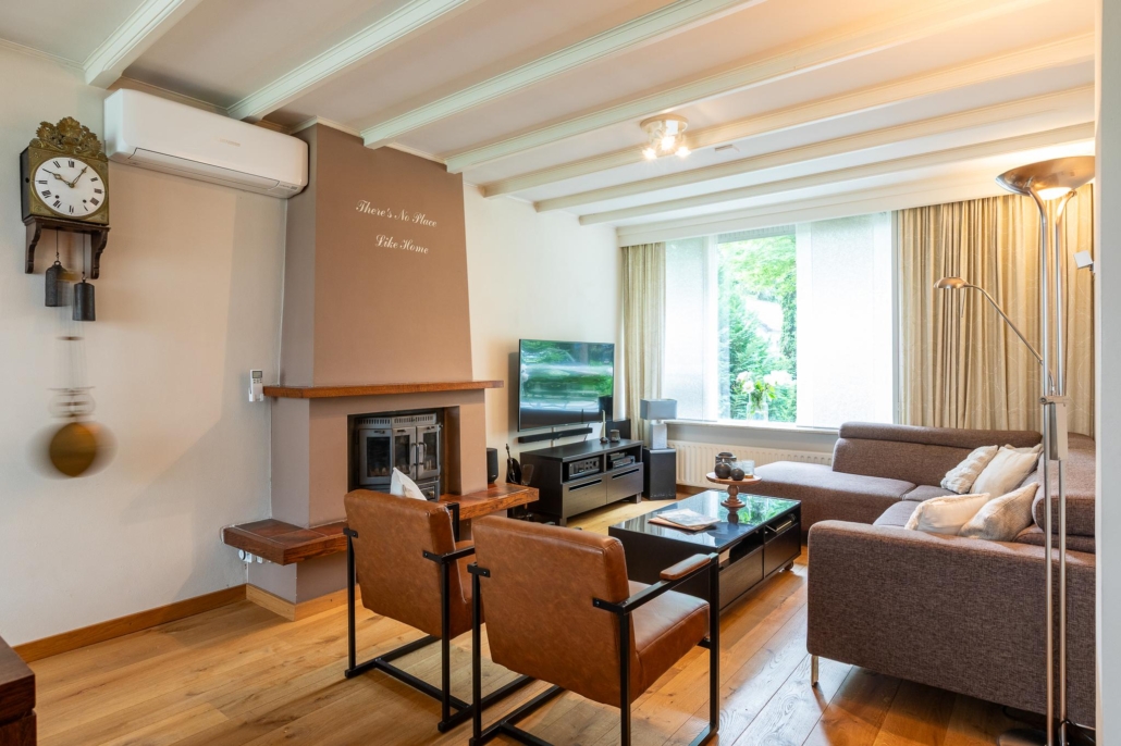 De woonkamer is in de jaren 70 uitgebouwd waardoor het ruim is opgezet en de mogelijkheid biedt voor het creëren van diverse zithoeken. De zithoek is momenteel gecreëerd rondom de open haard met fraai uitzicht over de voortuin. Een airco zorgt voor de nodige verkoeling maar ook warmte in de wintermaanden.