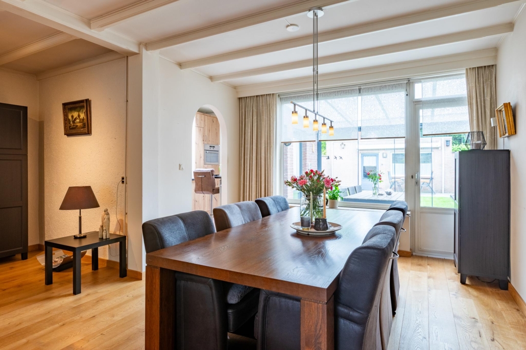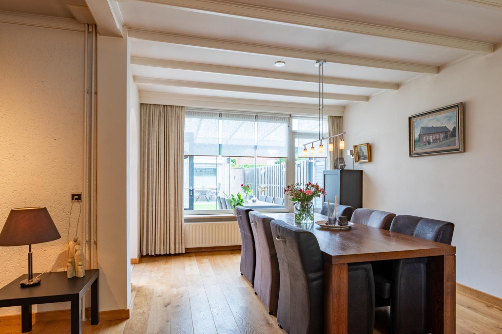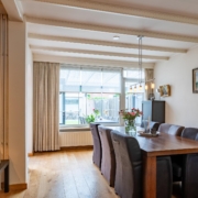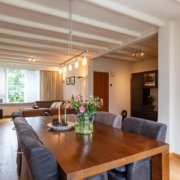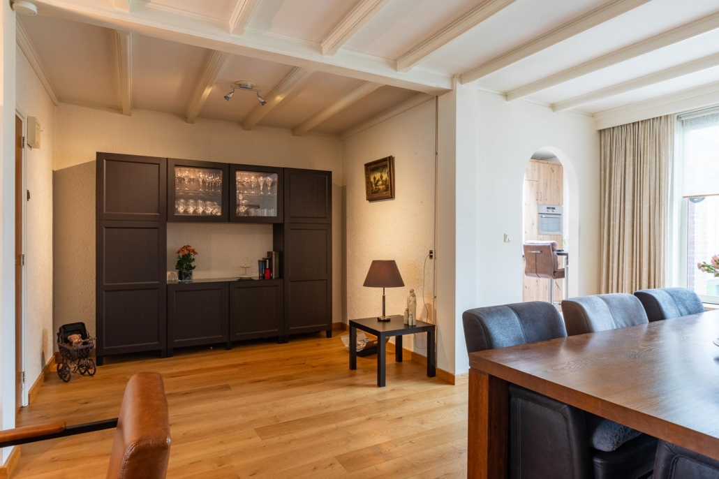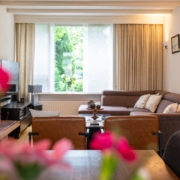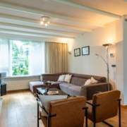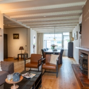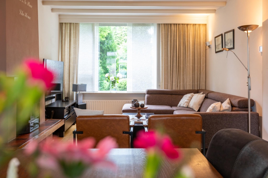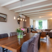 De woonkamer is in de jaren 70 uitgebouwd waardoor het ruim is opgezet en de mogelijkheid biedt voor het creëren van diverse zithoeken. De zithoek is momenteel gecreëerd rondom de open haard met fraai uitzicht over de voortuin. Een airco zorgt voor de nodige verkoeling maar ook warmte in de wintermaanden.