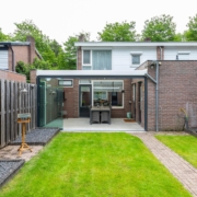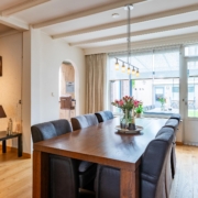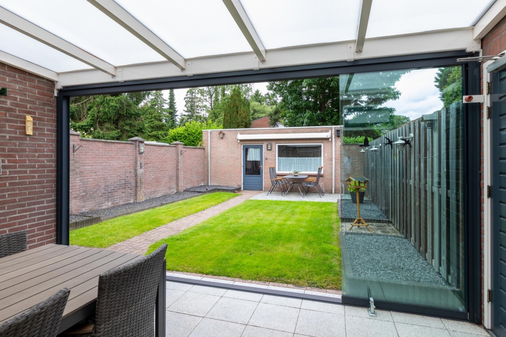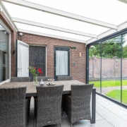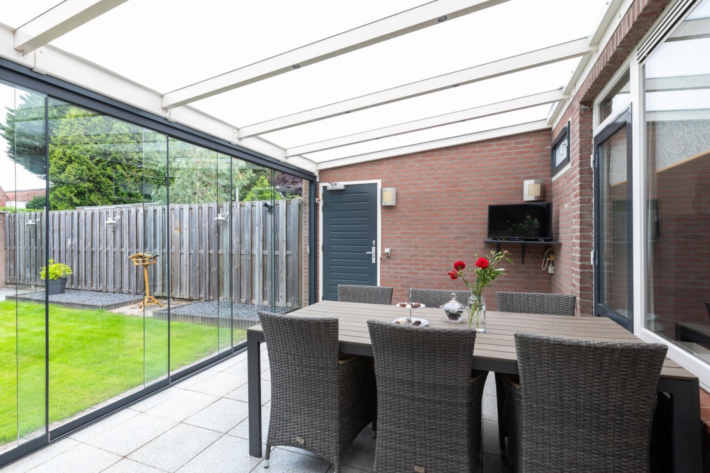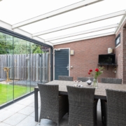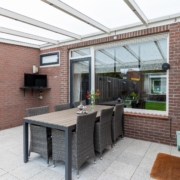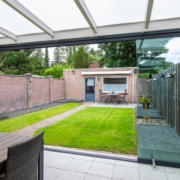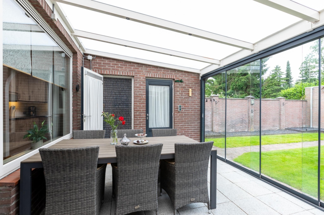 Vanuit de keuken loop je de aangebouwde serre in. In deze ruimte is het heerlijk vertoeven zowel in de zomer- als wintermaanden. De glazen panelen kunnen volledig open geschoven worden. Vanuit hier is er toegang tot de aangebouwde berging waarin de was-aansluitingen zich bevinden en opstelling c.v.-ketel.