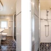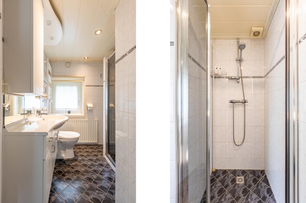 De badkamer is licht betegeld en voorzien van een douche, toilet en wastafel in een meubel.