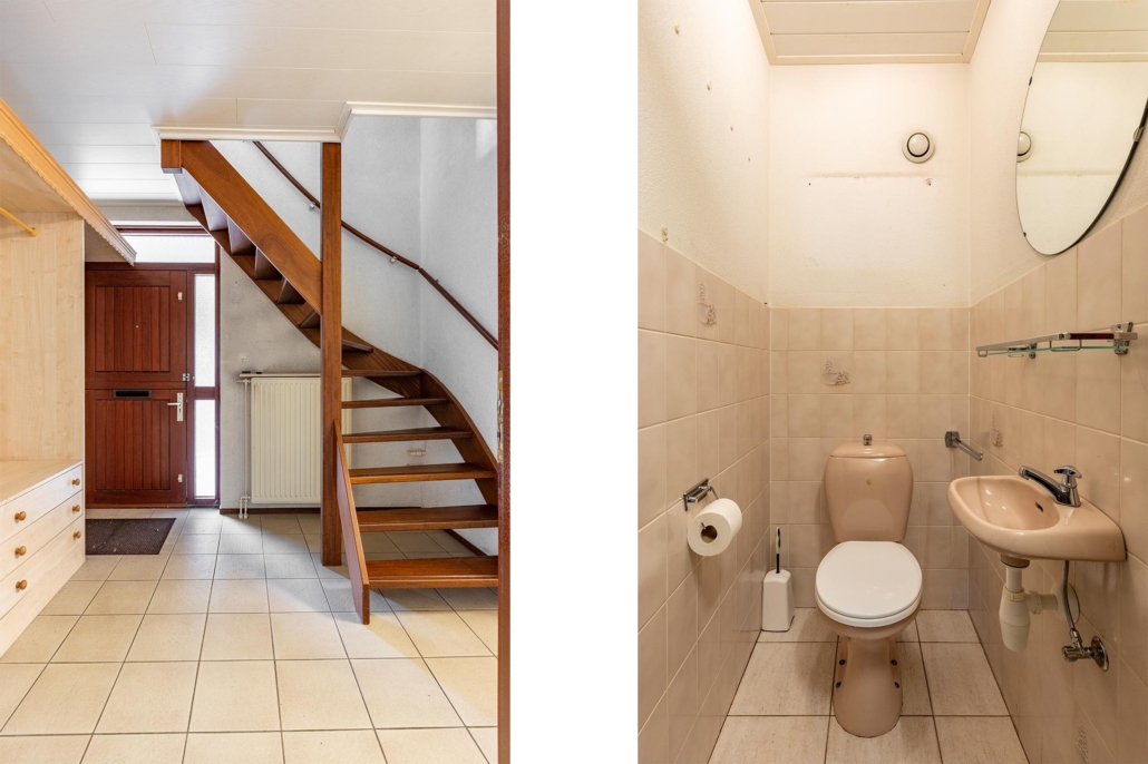 Via de overdekte entree kom je in de ruime hal met toegang tot de woonkamer, meterkast, nette toiletruimte en de trap naar de eerste verdieping.