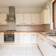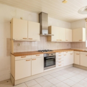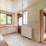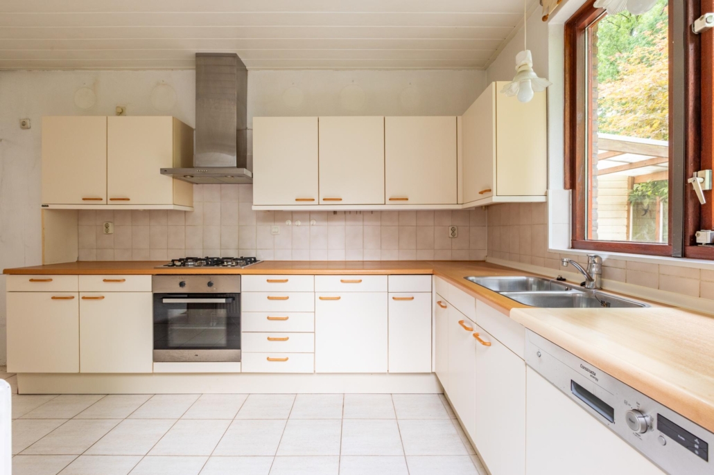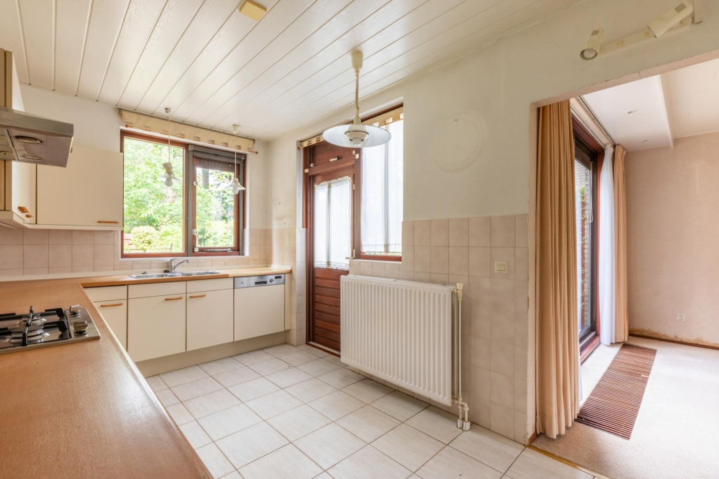 De halfopen keuken is eenvoudig maar ruim opgezet, met een praktische kunststof inrichting voorzien van veel onder- en bovenkastjes, een gaskookplaat, vaatwasser en een gezellig raam boven de spoelbak met zicht op de tuin. Via een extra deur is ook het terras direct bereikbaar.