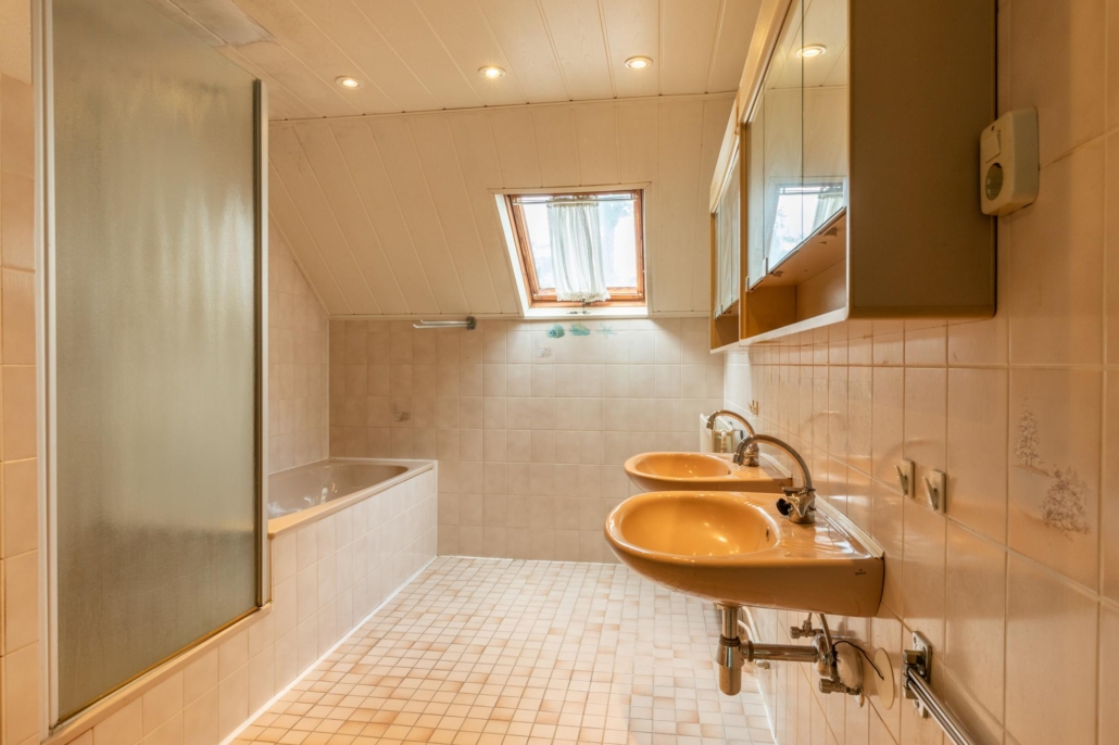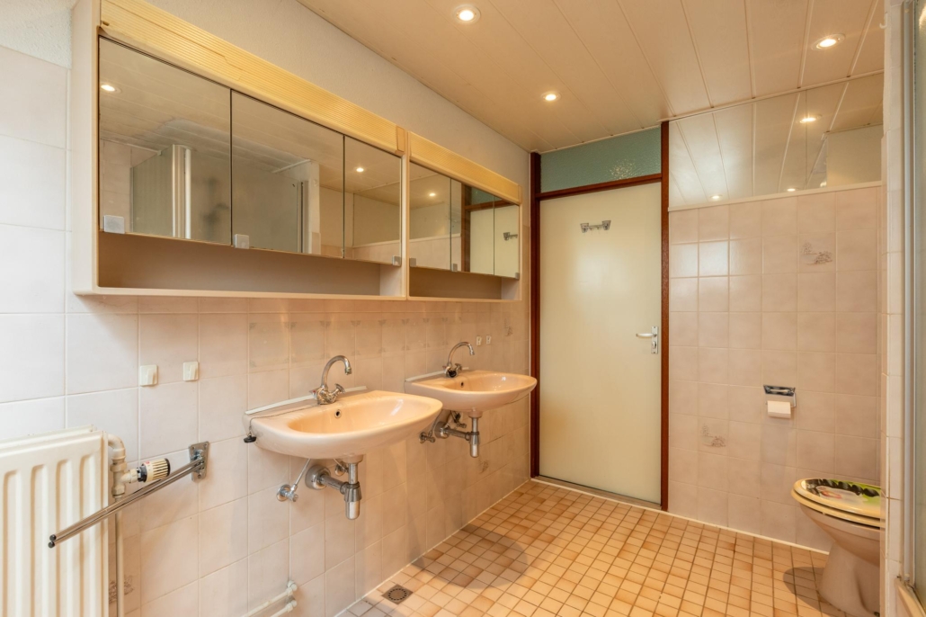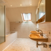 De badkamer is netjes en functioneel met twee wastafels, een ligbad, douchecabine en een toilet. Ook hier zorgt een raam voor daglicht en ventilatie.