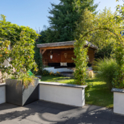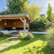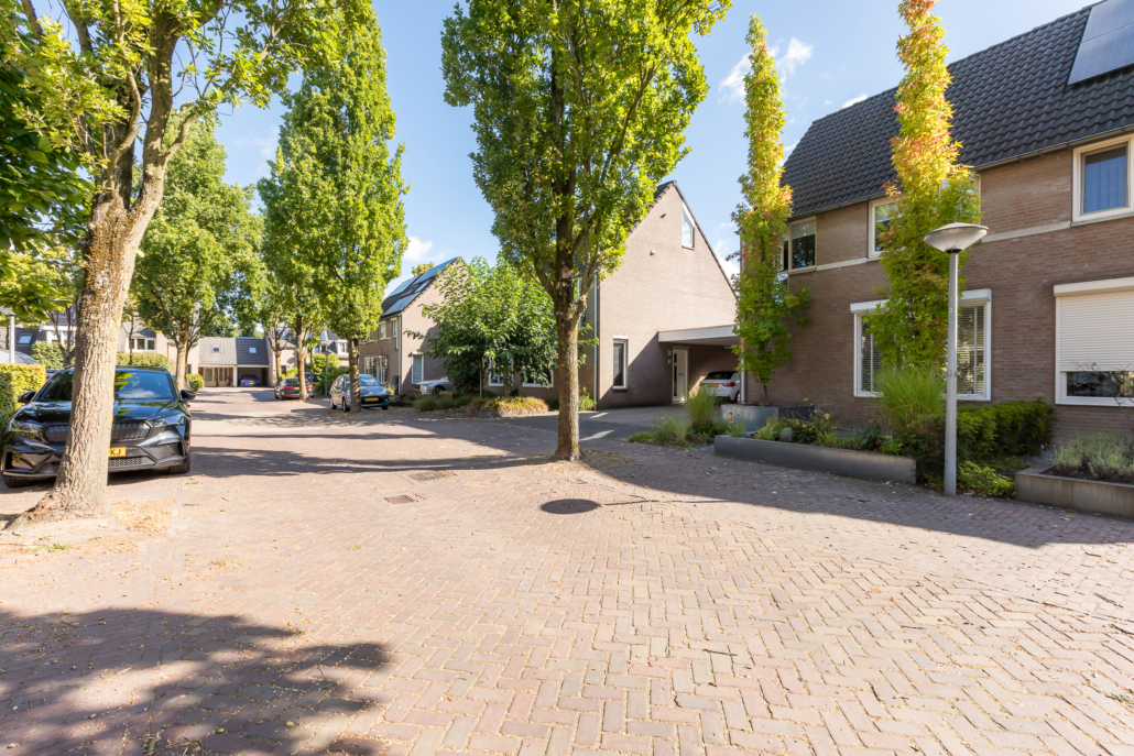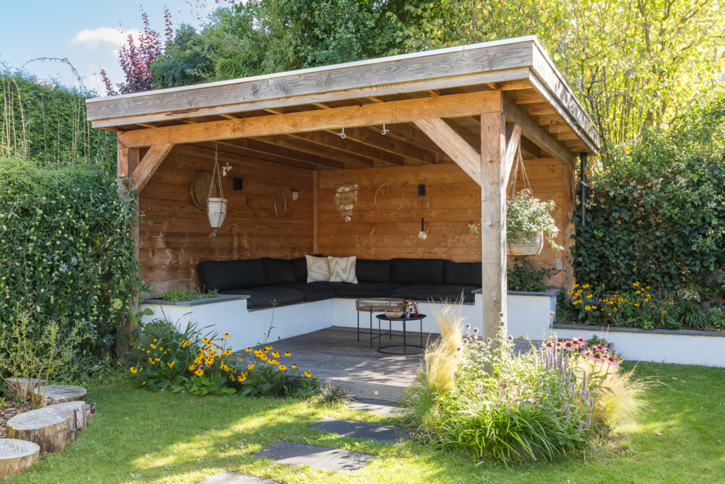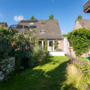 De fraai aangelegde achtertuin biedt volop privacy en rust. Direct aan de woning grenst een ruim terras, gevolgd door een gazon met sierlijke borders. Helemaal achterin wacht een gezellige overkapping met geïntegreerde zitbanken – dé plek om te ontspannen, het hele jaar door. Verder beschikt de tuin over een dubbele berging.