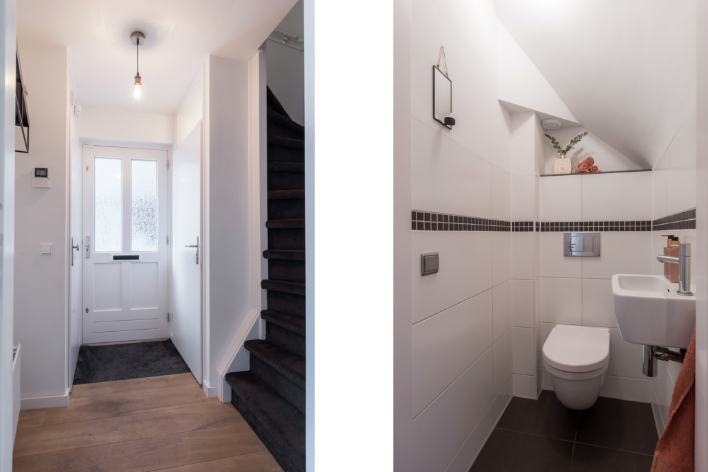 Je betreedt de woning via een verzorgde voortuin met overdekte entree. De hal geeft toegang tot de woonkamer, een moderne toiletruimte, de trapopgang naar de eerste verdieping en een moderne meterkast.