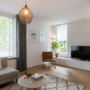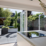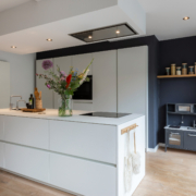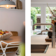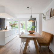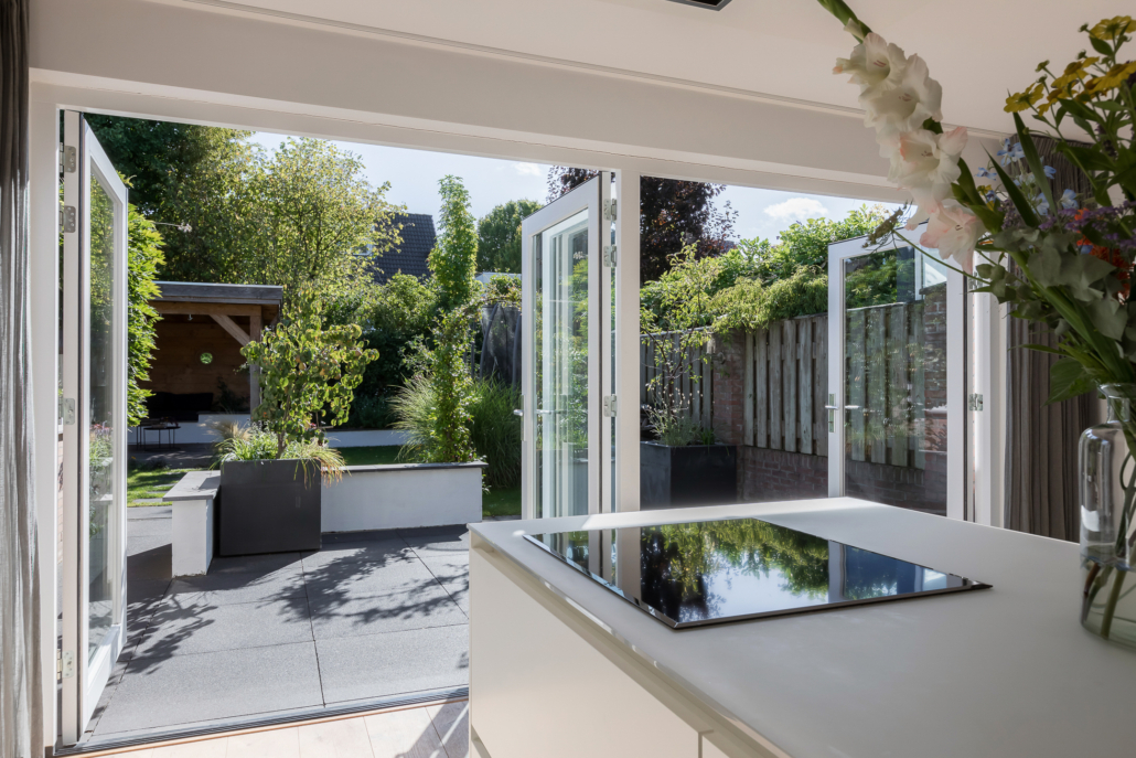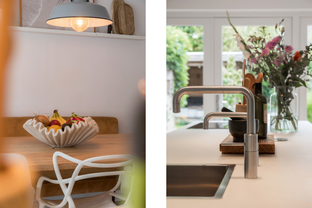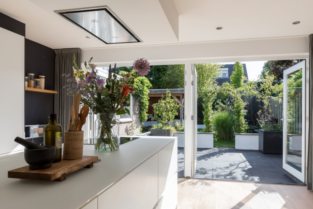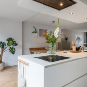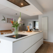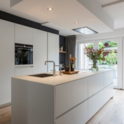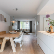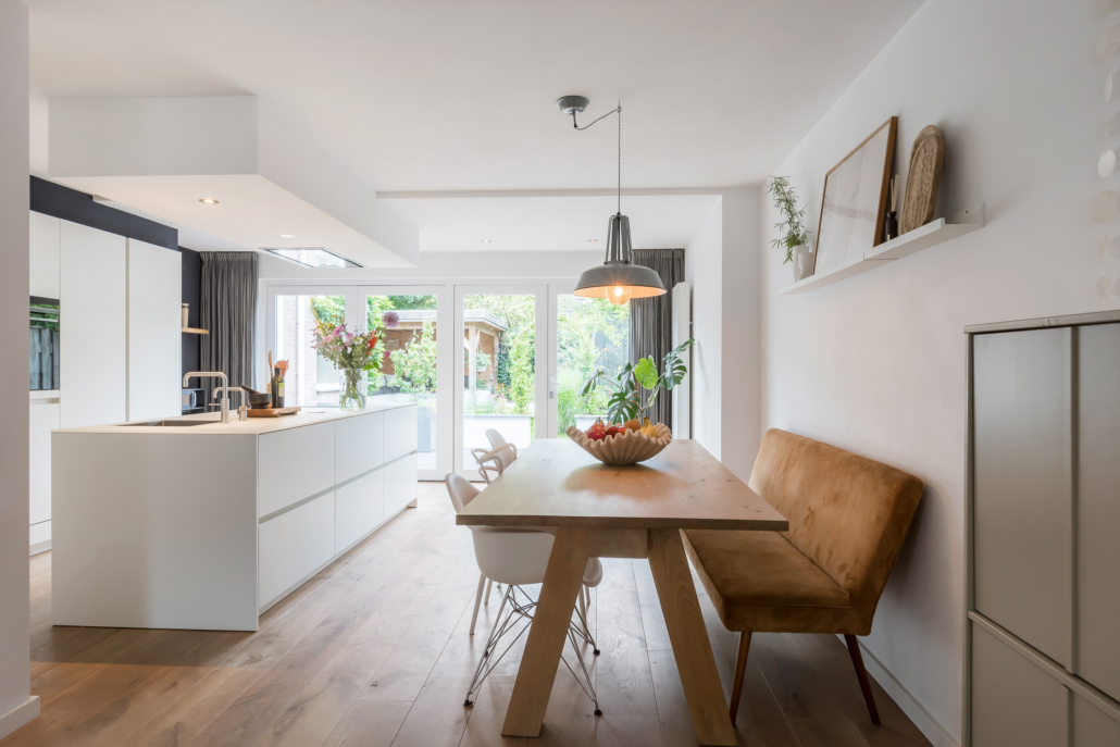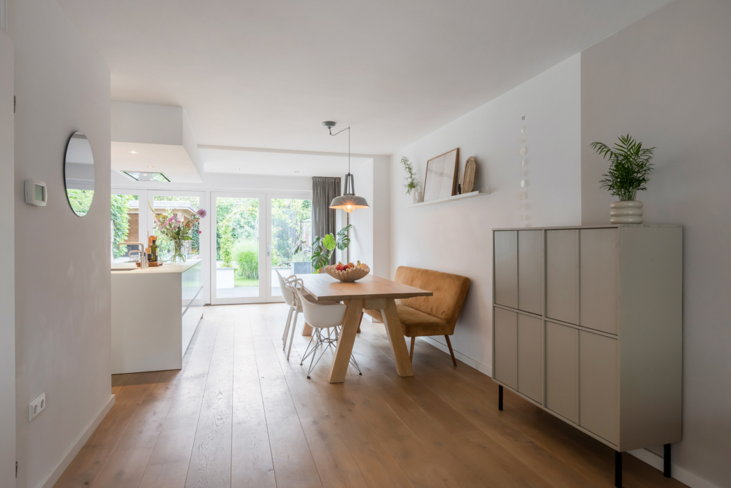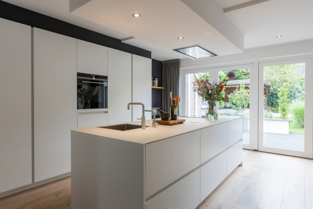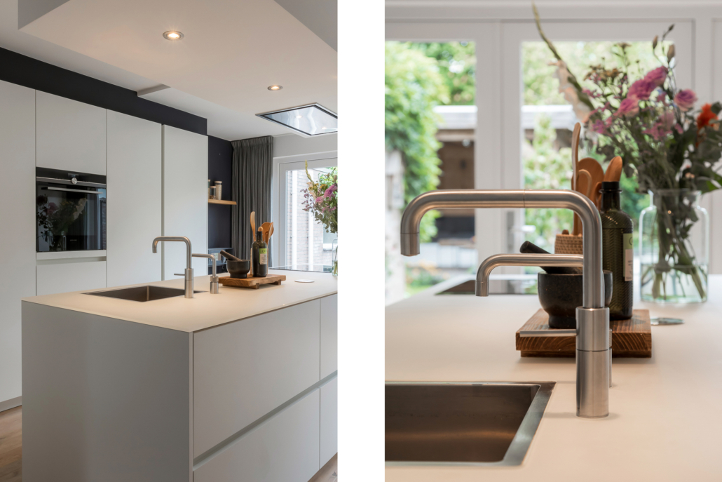 Aan de achterzijde is de woning uitgebouwd en is er een leefkeuken ontstaan. Deze luxe keuken (Van Diessen) is voorzien van een kookeiland met glazen aanrechtblad, een Quooker, combi-stoomoven, vaatwasser, koelkast, vriezer én volop bergruimte. Dankzij de dubbele openslaande deuren naar het terras geniet je hier van het binnen én buiten leven in alle seizoenen.