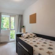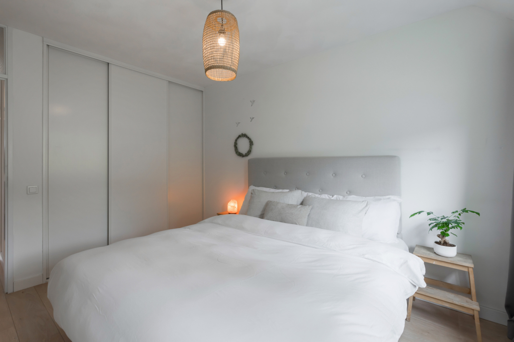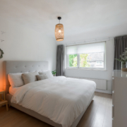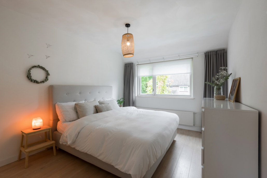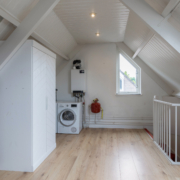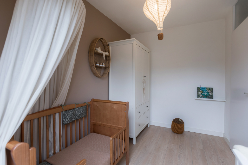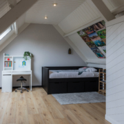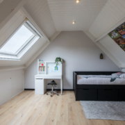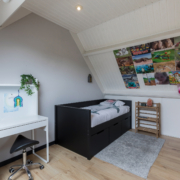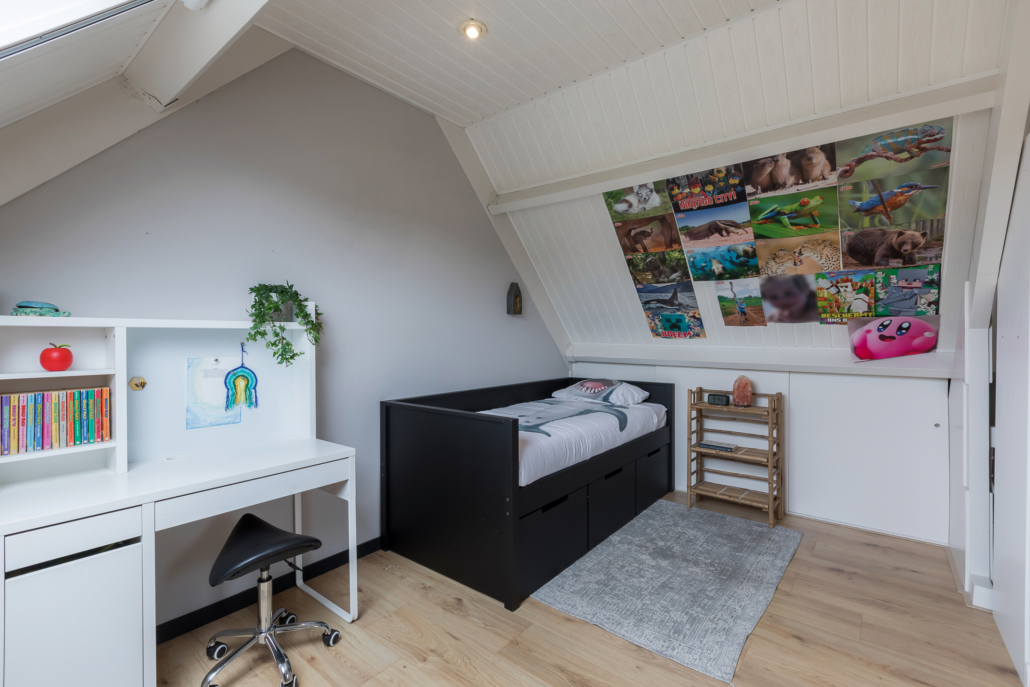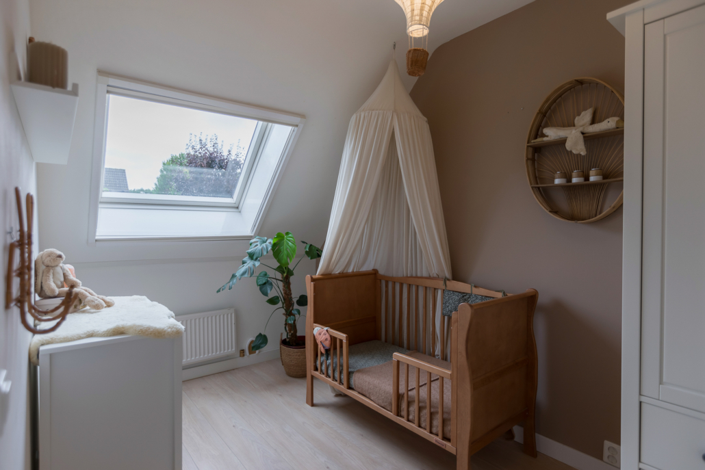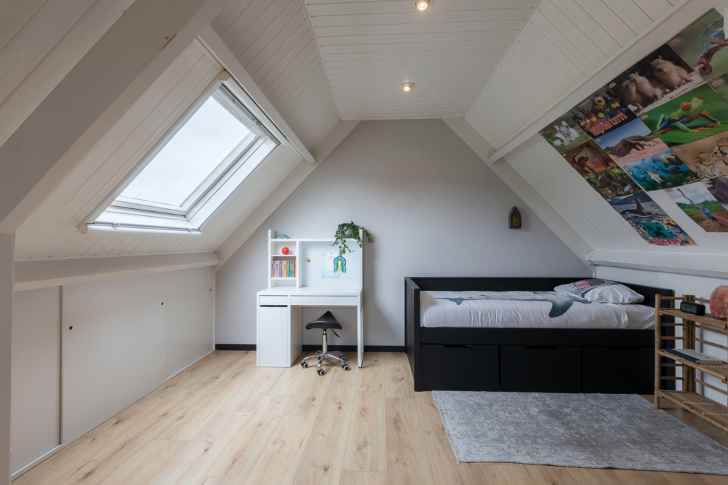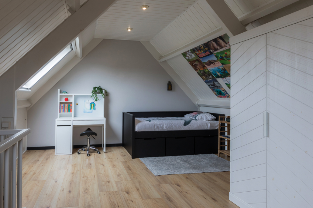 Via een vaste trap bereik je de volwaardige zolderverdieping – nu ingericht als extra ruime slaapkamer. Je vindt hier eveneens de opstelling voor wasmachine en droger, C.V.-ketel, dakraam en is afgewerkt met een nette laminaatvloer. Een ideale plek voor werken, logeren of opgroeiende kinderen!