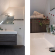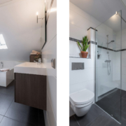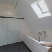 De badkamer is modern betegeld en voorzien van een grote inloopdouche, extra breed wastafelmeubel, ligbad, toilet en een dakraam voor natuurlijk licht.