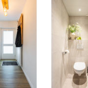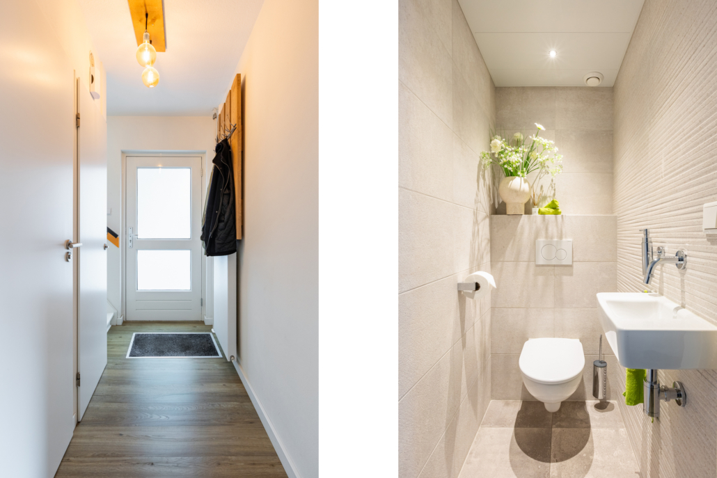 Via de verzorgd aangelegde voortuin en oprit bereik je de entree van de woning. De hal biedt ruimte voor een garderobe en hier bevinden zich de meterkast en toiletruimte. Frisse, moderne toiletruimte met wandcloset en fonteintje.