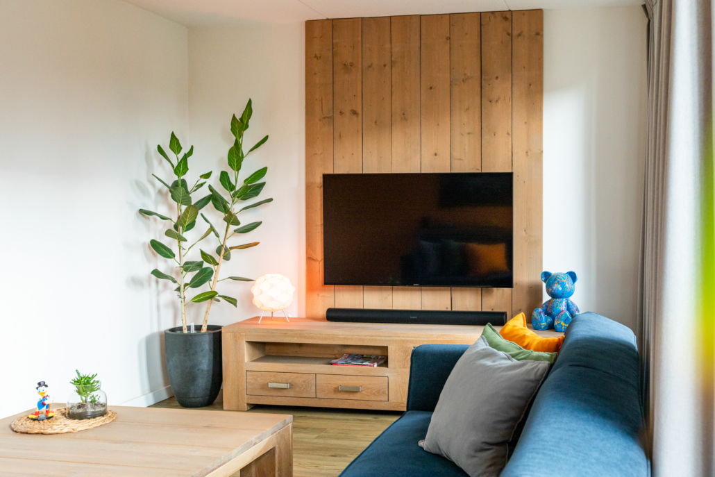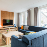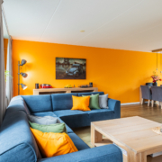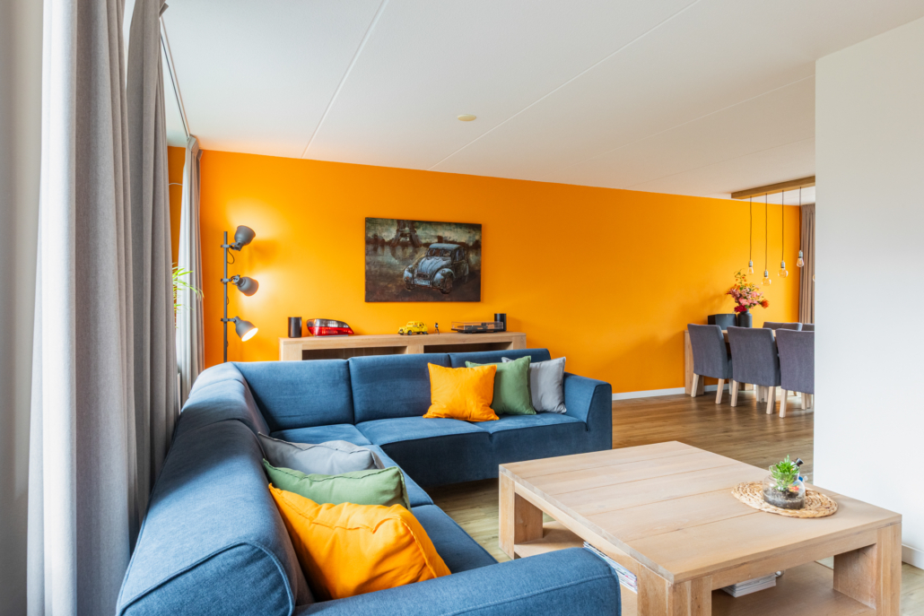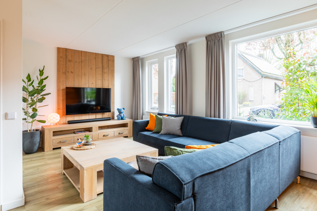 Het woongedeelte is opgesteld in L-vorm. Aan de voorzijde van de woning is de zithoek gesitueerd. De vele raampartijen zorgen voor prettig lichtinval. De gehele ruimte is voorzien van een PVC vloer. Aan de achterzijde bij de keuken is voldoende ruimte om een eethoek te creëren. Vanuit hier ook toegang tot de achtertuin.