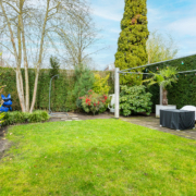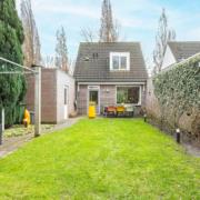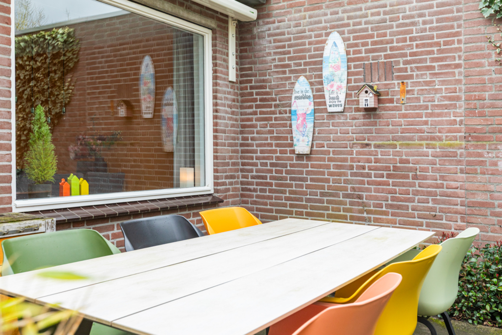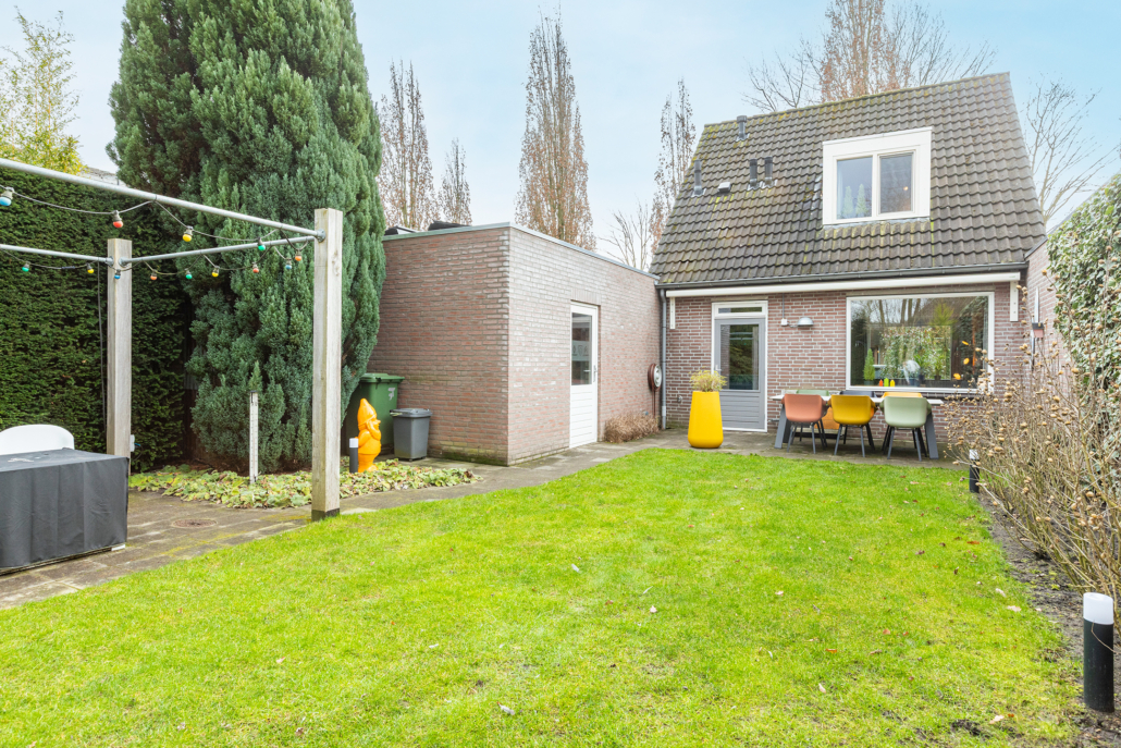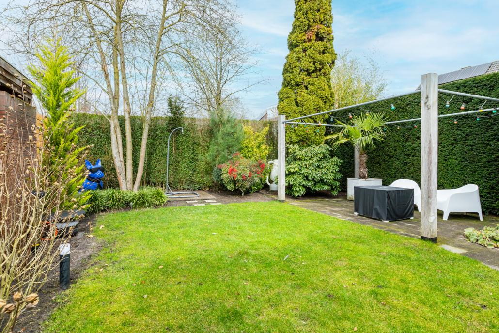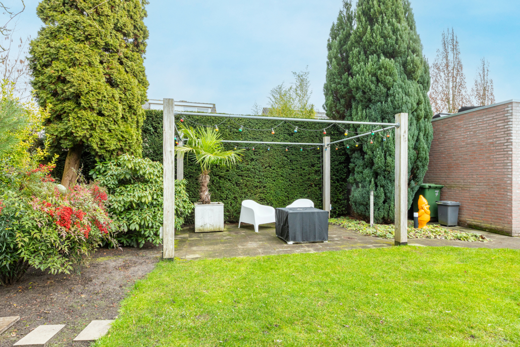 De achtertuin is verrassend diep en beschikt over meerdere terrassen. De tuin is voorzien van een gazon, diverse plantenborders en volwassen beplantingen en bomen. Aan de achterzijde van de woning bevindt zich bovendien een zonneluifel over de volledige breedte van het huis.