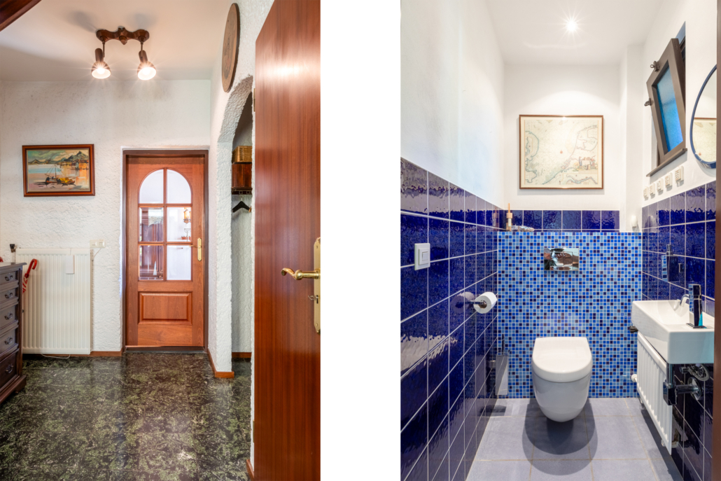 Bij binnenkomst valt direct de ruime hal op, voorzien van trapopgang naar de eerste verdieping, garderobe, meterkast en deels betegelde toiletruimte voorzien van een hangend toilet, fonteintje en raam. Vanuit de hal bereikt u zowel de dichte keuken als de ruime woonkamer in L-vorm.