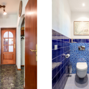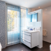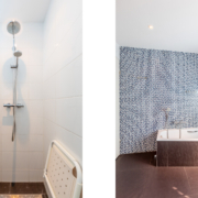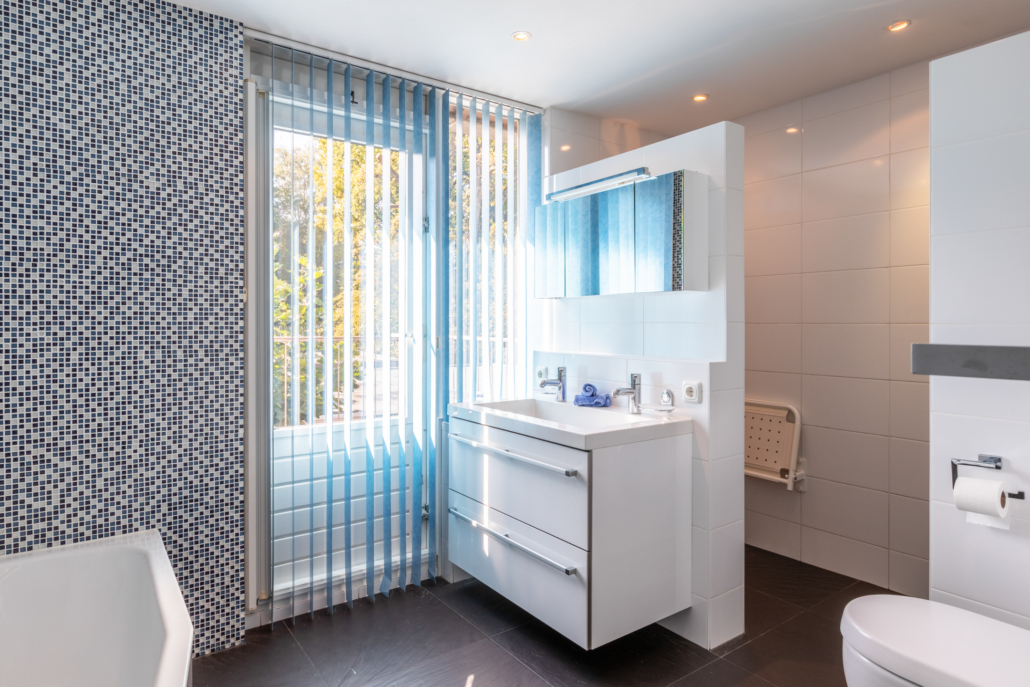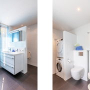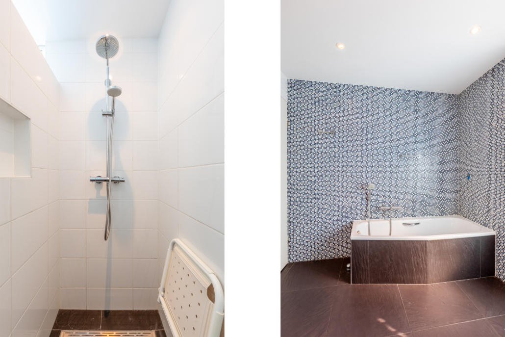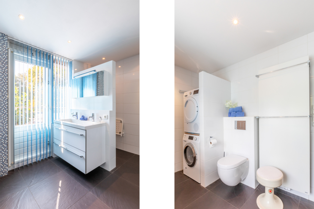 De royale badkamer is voorzien van een ligbad, inloopdouche, dubbele wastafel, hangend toilet en toegang tot een balkon. De badkamer is volledig betegeld, deels wit en deels met mozaïek steentjes. Tevens bevinden de aansluitingen voor wasmachine en droger zich ook op de badkamer.