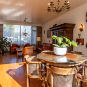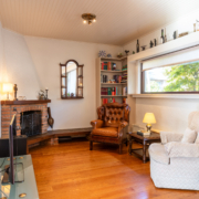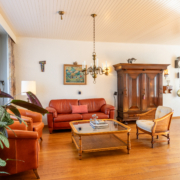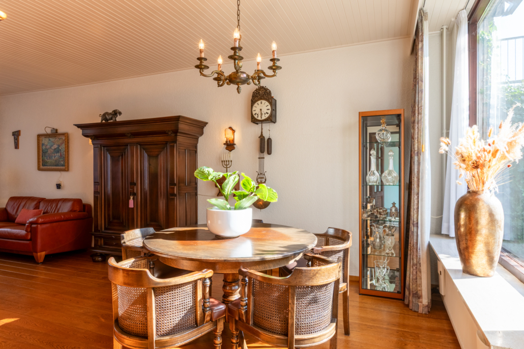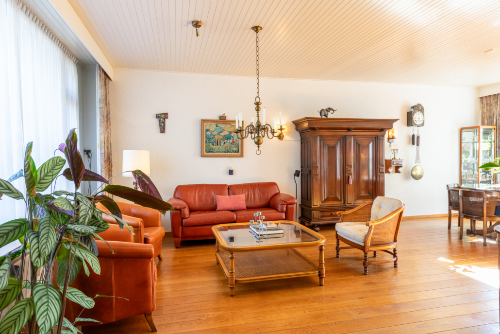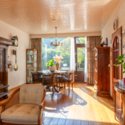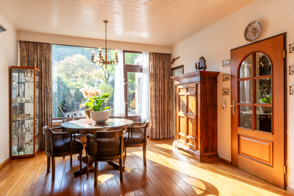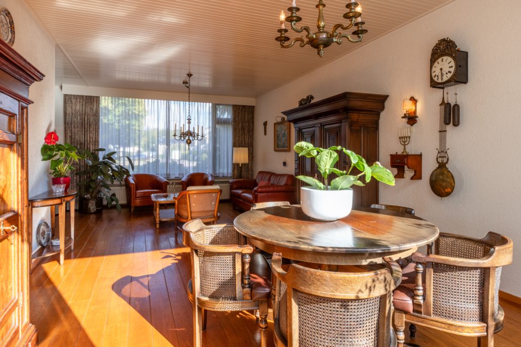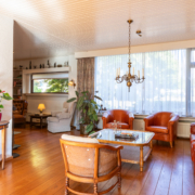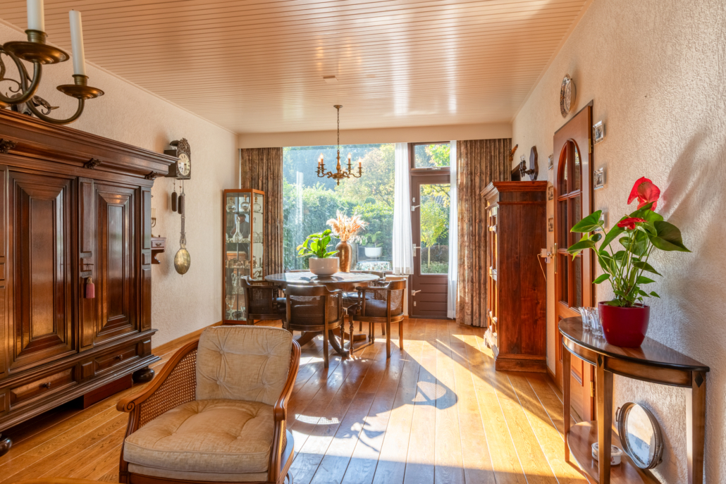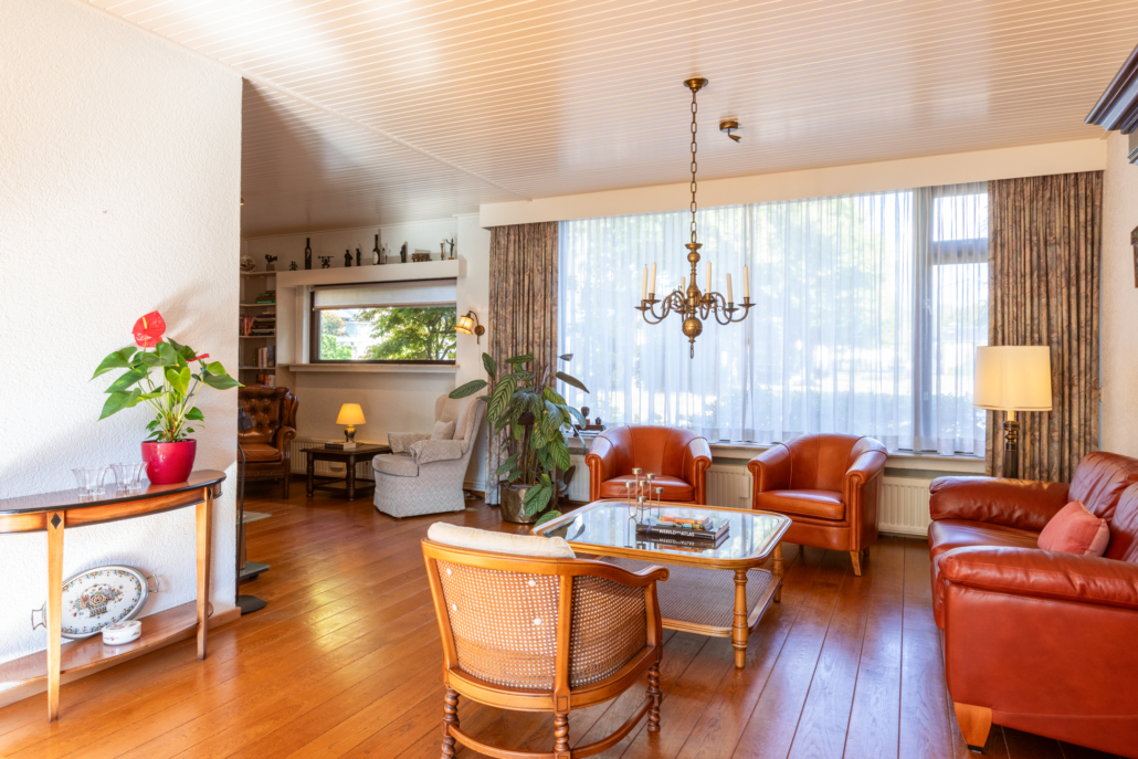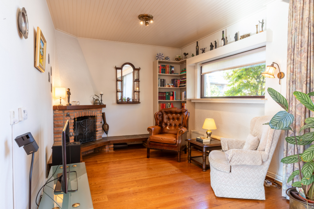 De ruime woonkamer met parketvloer, open haard en door de grote ramen aan de voor- en achterzijde heeft het uitzicht op zowel voor- als achtertuin. Via de woonkamer bereikt u de dichte keuken.
