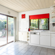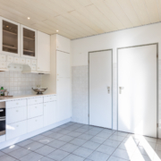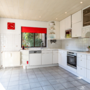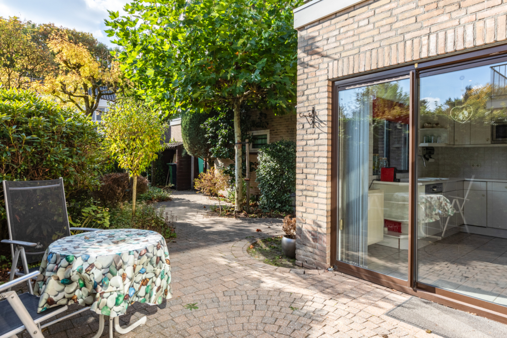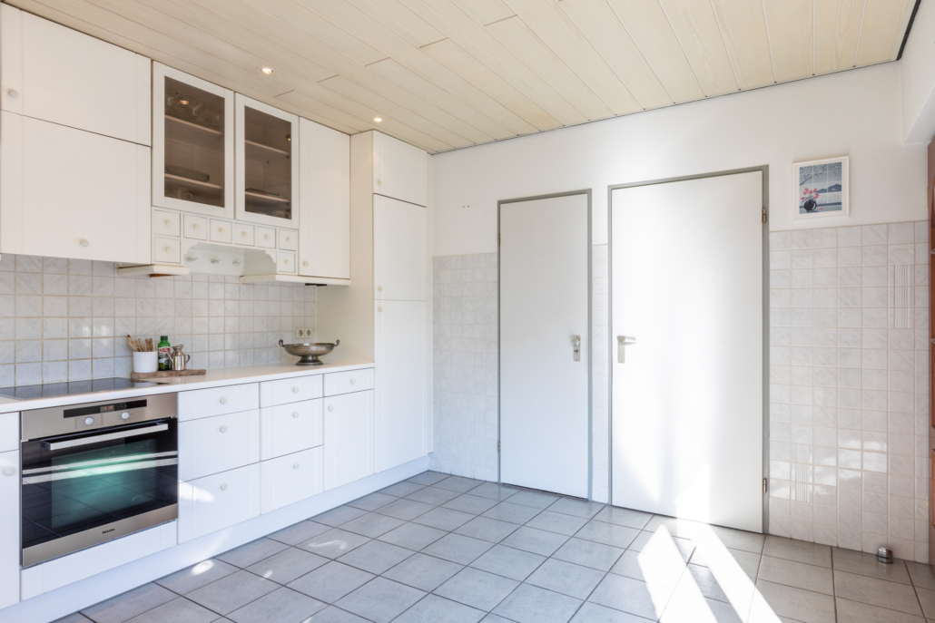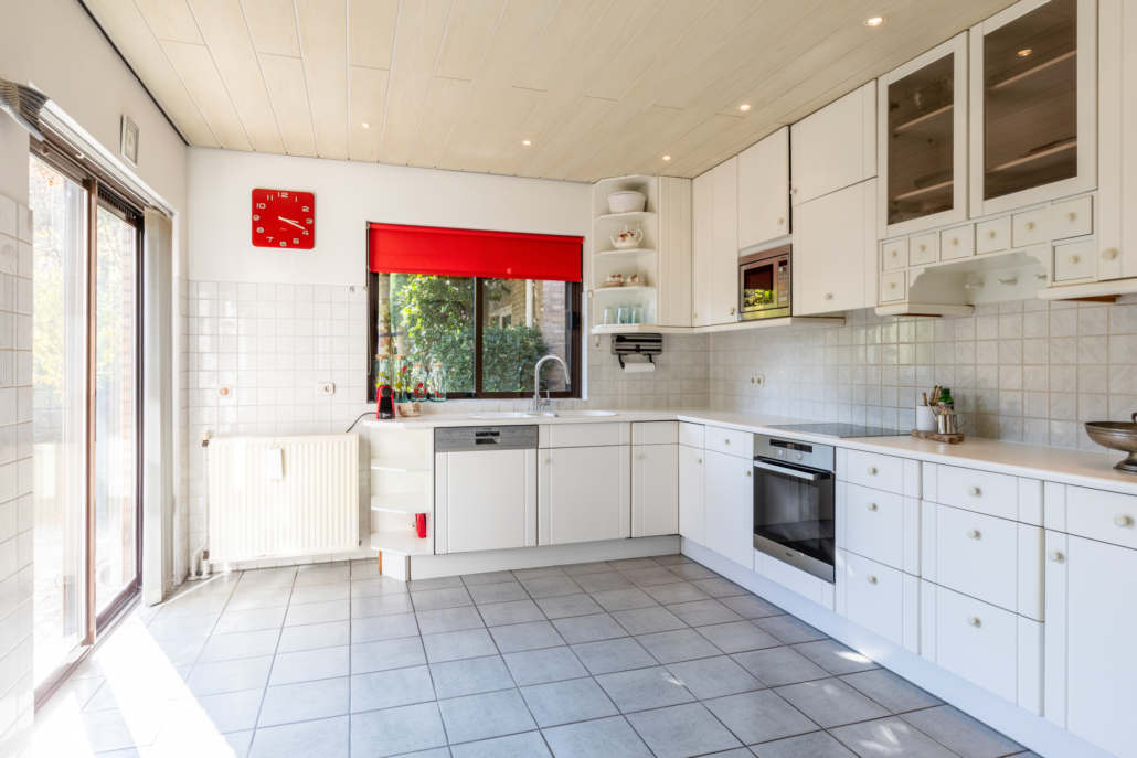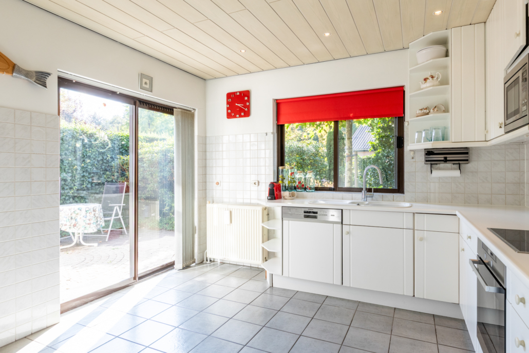 De lichte keuken is netjes en functioneel en beschikt over diverse inbouwapparatuur zoals een koelkast met vriesvak, vaatwasser, oven en magnetron die recent vernieuwd zijn (o.a. Bosch, Siemens en Miele). Tevens beschikt de keuken over een handige inbouwkast wat weer voor extra bergruimte zorgt. Naast de inbouwkast bevindt zich een deur die weer in de hal/garderobe uitkomt. Dankzij de schuifpui loopt u ook vanuit de keuken zo de tuin in.
